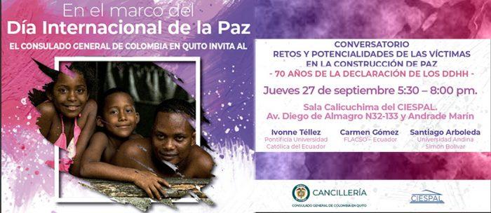 El Consulado General de Colombia en Quito invita al conversatorio: «Retos y potencialidades de las víctimas en la construcción de paz”, el jueves 27 de…