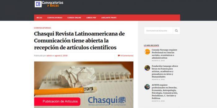 Síntesis: Convocatoria abierta para la recepción de artículos científicos de la Revista Chasqui. Convocatorias y Becas Fecha: 02 de agosto de 2018 Link: https://bit.ly/2nFEClO