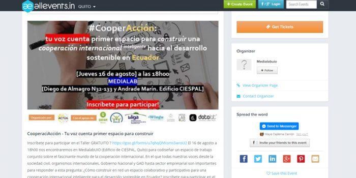 Síntesis: calendario de eventos de Medialab, CooperaciAcción – Tu voz cuenta primer espacio para construir. Allevents Fecha: 12 de agosto de 2018 Link: https://bit.ly/2BbqWc7