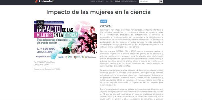 Síntesis: Publicación sobre el Seminario Internacional Impacto de las mujeres en la ciencia. Koikofait Fecha: 17 de abril de 2018 Link: https://bit.ly/2vlhj7A