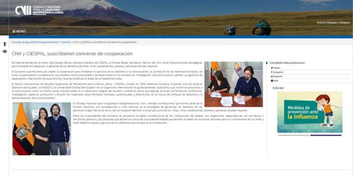 Síntesis: Publicación sobre la firma de convenio entre el CNII y CIESPAL . Consejo Nacional para la Igualdad Intergeneracional Fecha: 23 abril de 2018 Link: https://bit.ly/2HoWWeL