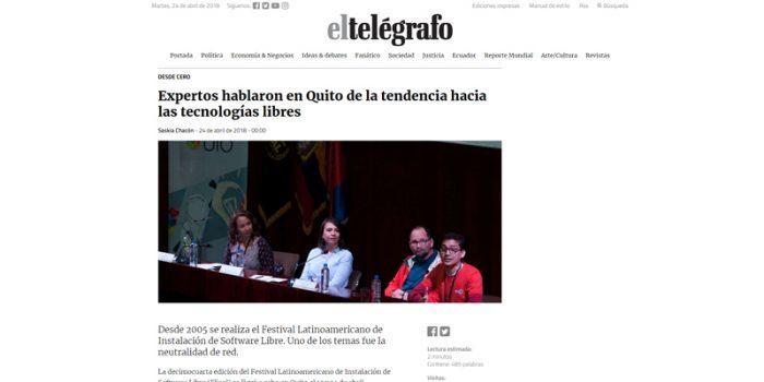 Síntesis: Publicación sobre FLISoL 2018, evento realizado el 13 y 14 de abril en CIESPAL. El Telégrafo Fecha: 24 abril de 2018 Link: https://bit.ly/2Kbr0c0