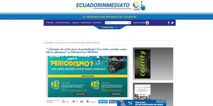 Síntesis: Publicación sobre el evento organizado por CIESPAL ¿Tiempos de crisis para el periodismo? Las redes sociales como nueva amenaza. Ecuador Inmediato Fecha: 25 abril de 2018 Link: …