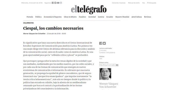 Síntesis: Publicación sobre los cambios en CIESPAL y la nueva Dirección General. El Telégrafo Fecha: 25 abril de 2018 Link: https://bit.ly/2vJHcyi
