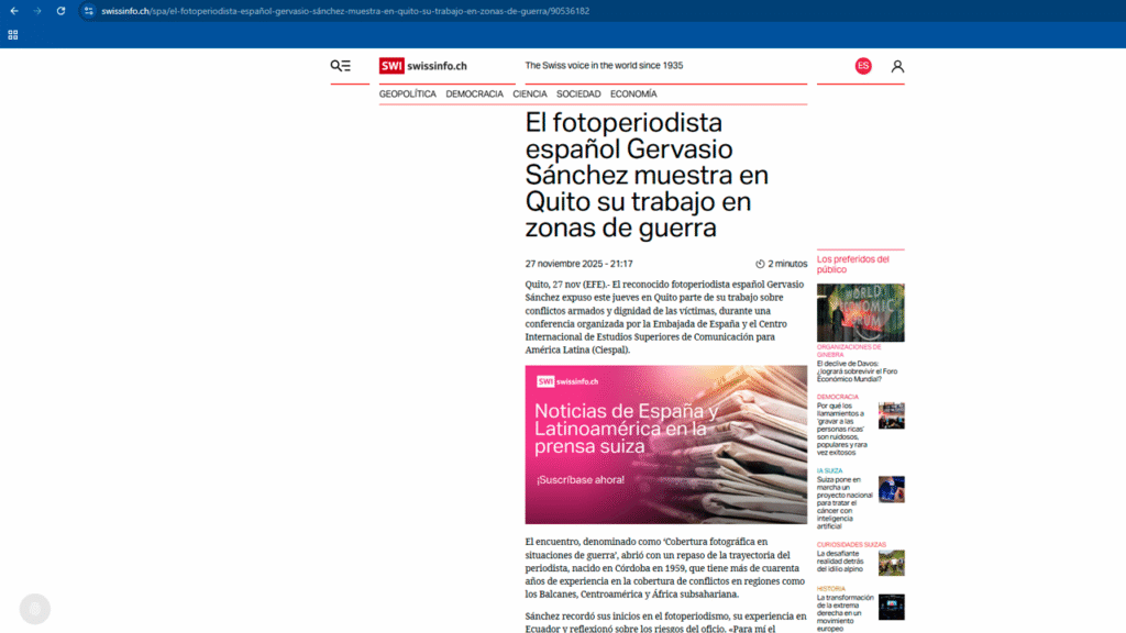 La nota está publicada en:Medio: The Swiss voice Fecha: 27 de noviembre de 2025Link: https://www.swissinfo.ch/spa/el-fotoperiodista-espa%C3%B1ol-gervasio-s%C3%A1nchez-muestra-en-quito-su-trabajo-en-zonas-de-guerra/90536182