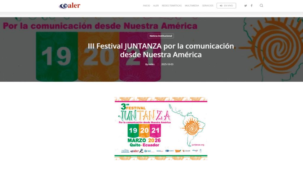 La nota ha sido publicada en:Medio: Asociación Latinoamericana de Educación y Comunicación Popular – ALERFecha: 2025-10-03Link: https://aler.org/iii-festival-juntanza-por-la-comunicacion-desde-nuestra-america/