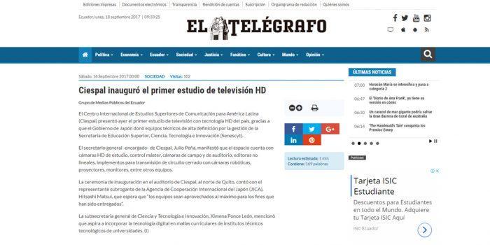 Síntesis: Nota sobre la ceremonia de inauguración de los equipos donados por el gobierno del Japón al CIESPAL para la capacitación en televisión digital. El Telégrafo Fecha: 16…