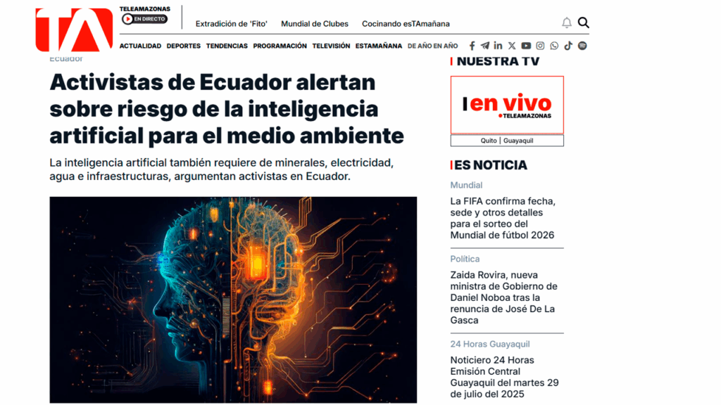 La nota está publicada en:Medio de Comunicación: TELEAMAZONASFecha: 17 de julio de 2025Link: https://www.teleamazonas.com/actualidad/noticias/ecuador/inteligencia-artificial-activistas-advierten-impacto-medio-ambiente-ecuador-98894/ Activistas de Ecuador alertan sobre riesgo de la inteligencia artificial para…