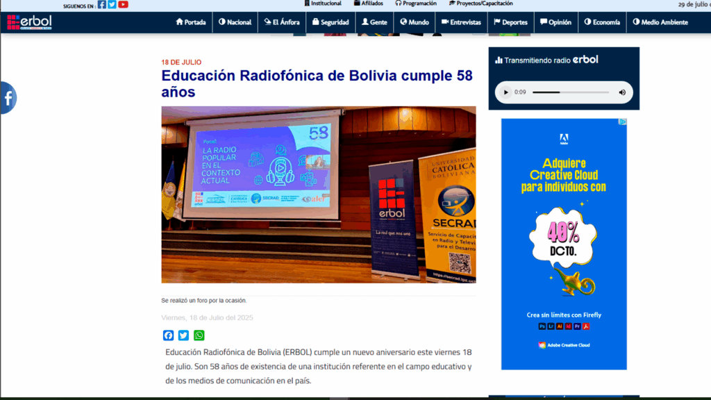 La nota está publicada en:Página Institucional: Educación Radiofónica de Bolivia (ERBOL)Fecha: 18 de julio de 2025Link: https://erbol.com.bo/gente/educaci%C3%B3n-radiof%C3%B3nica-de-bolivia-cumple-58-a%C3%B1os Educación Radiofónica de Bolivia cumple 58 añosEducación Radiofónica…