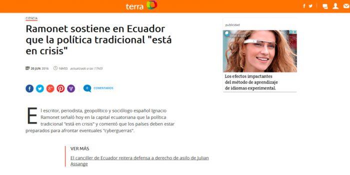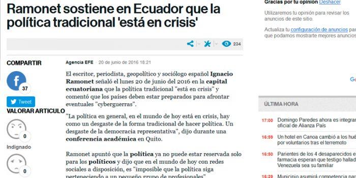 Síntesis: El escritor, periodista, geopolítico y sociólogo español Ignacio Ramonet señaló el lunes 20 de junio del 2016 en la capital ecuatoriana que la política…