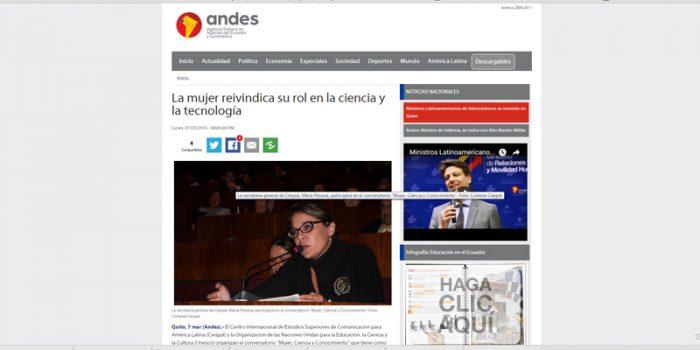 Síntesis: Entrevista a María PESSINA, Secretaria General de CIESPAL sobre el Conversatorio “Mujer, Ciencia y Conocimiento” Agencia ANDES Fecha: lunes 07 de marzo de 2016 Link: http://bit.ly/21TJC6E