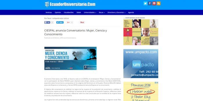 Síntesis: Nota de prensa sobre el Conversatorio «Mujer, Ciencia y Conocimiento» EcuadorUniversitario Fecha: martes 23 de febrero de 2016 Link: http://bit.ly/1pbEYzJ