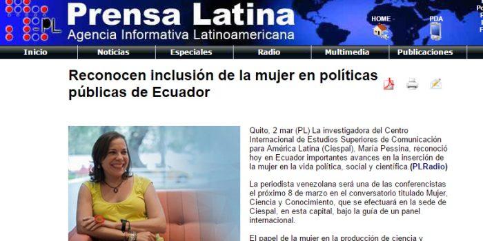 Síntesis: Entrevista a María PESSINA, Secretaria General de CIESPAL sobre el Conversatorio «Mujer, Ciencia y Conocimiento» Agencia Prensa Latina Fecha: miércoles 02 de marzo de 2016 Link: http://bit.ly/1VTlwlu