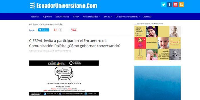 Síntesis: Este evento académico se realizará el próximo viernes 4 de marzo de 2016, desde las 09:00, en las instalaciones de CIESPAL, y está organizado…