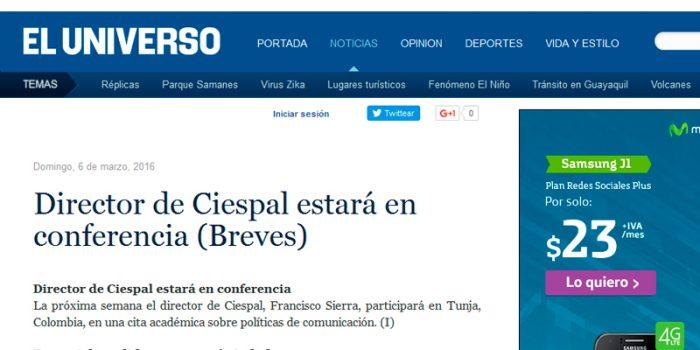 Síntesis: La próxima semana el director de Ciespal, Francisco Sierra, participará en Tunja, Colombia, en una cita académica sobre políticas de comunicación. (I) Diario El…