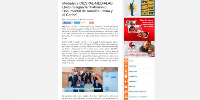 Síntesis: En 2015, CIESPAL postuló su Mediateca CIESPAL-MEDIALAB Quito para que formara parte del Registro Regional del Programa Memoria del Mundo de la UNESCO. Este programa recoge documentos de América…