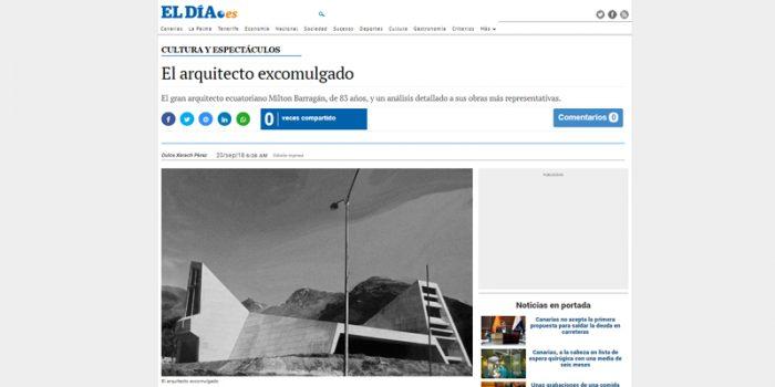 Síntesis: Mención a CIESPAL como una de las obras del reconocido arquitecto ecuatoriano, Milton Barragán. El Día.es Fecha: 23 de septiembre de 2018 Link: https://bit.ly/2xKFf2o