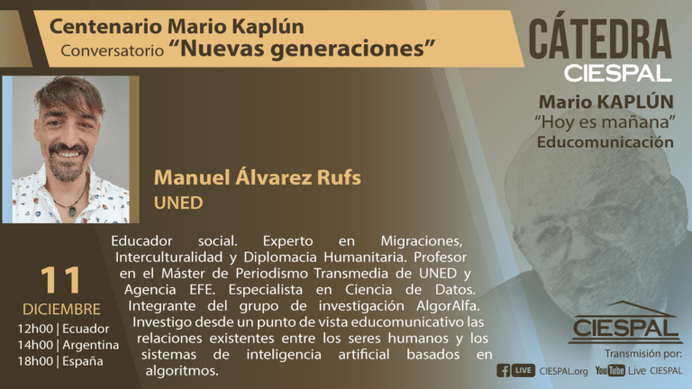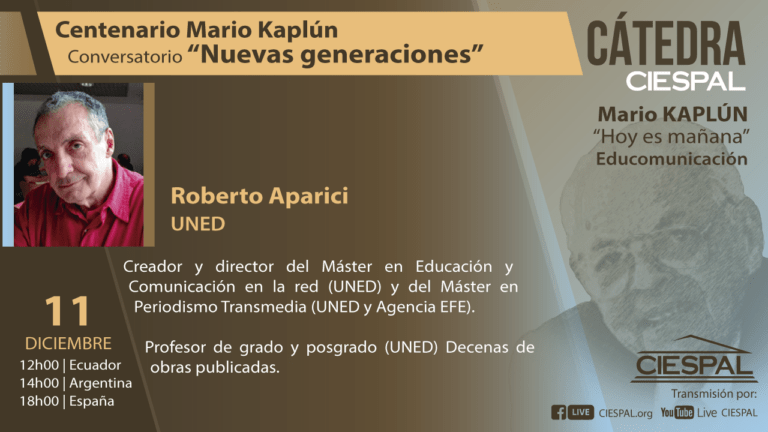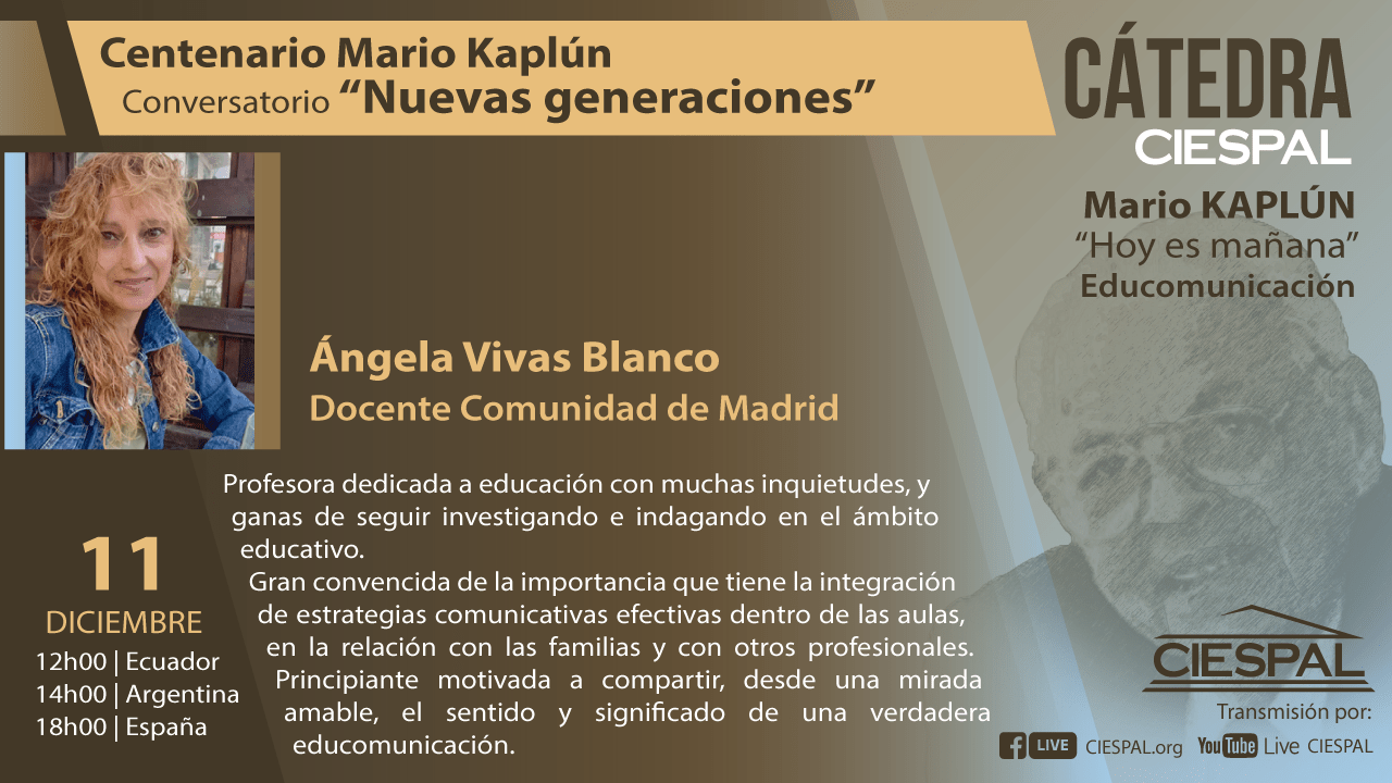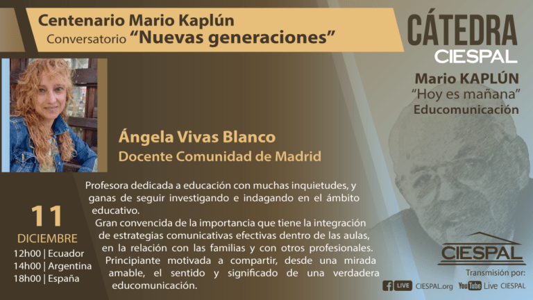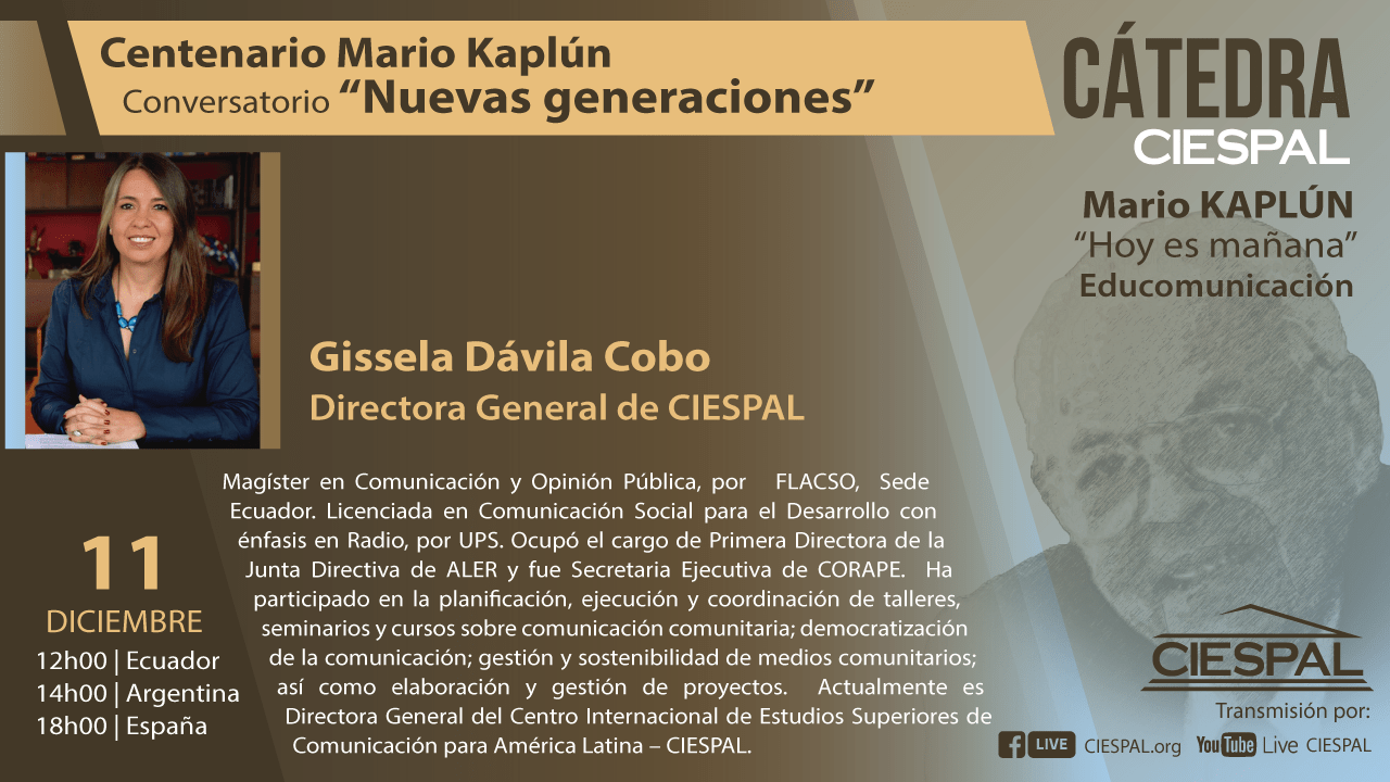 En el marco de la Cátedra CIESPAL de Educomunicación Mario Kaplún «Hoy es mañana» y en el marco del Centerio de Mario Kaplún, hemos organizado el conversatorio: «Nuevas generaciones» que lo realizaremos el 11 de diciembre, a las 12h00 de Ecuador, 14h00 de Argentina y 18h00 de España.