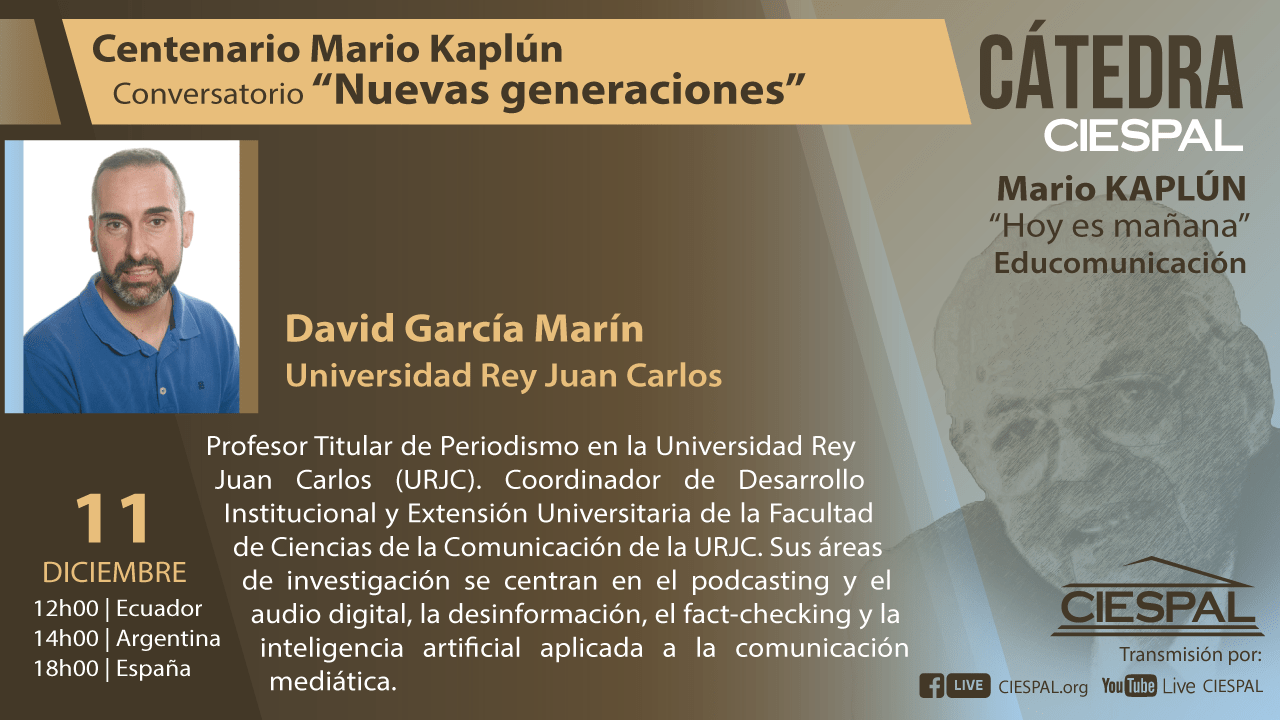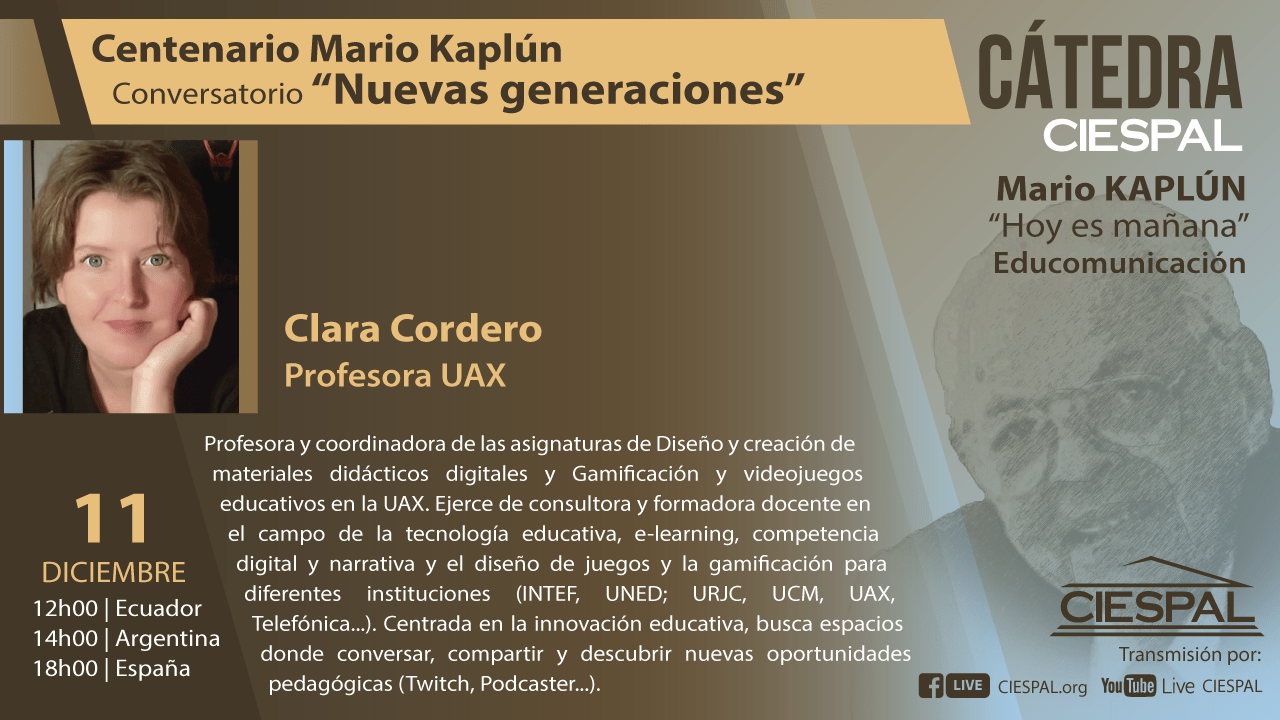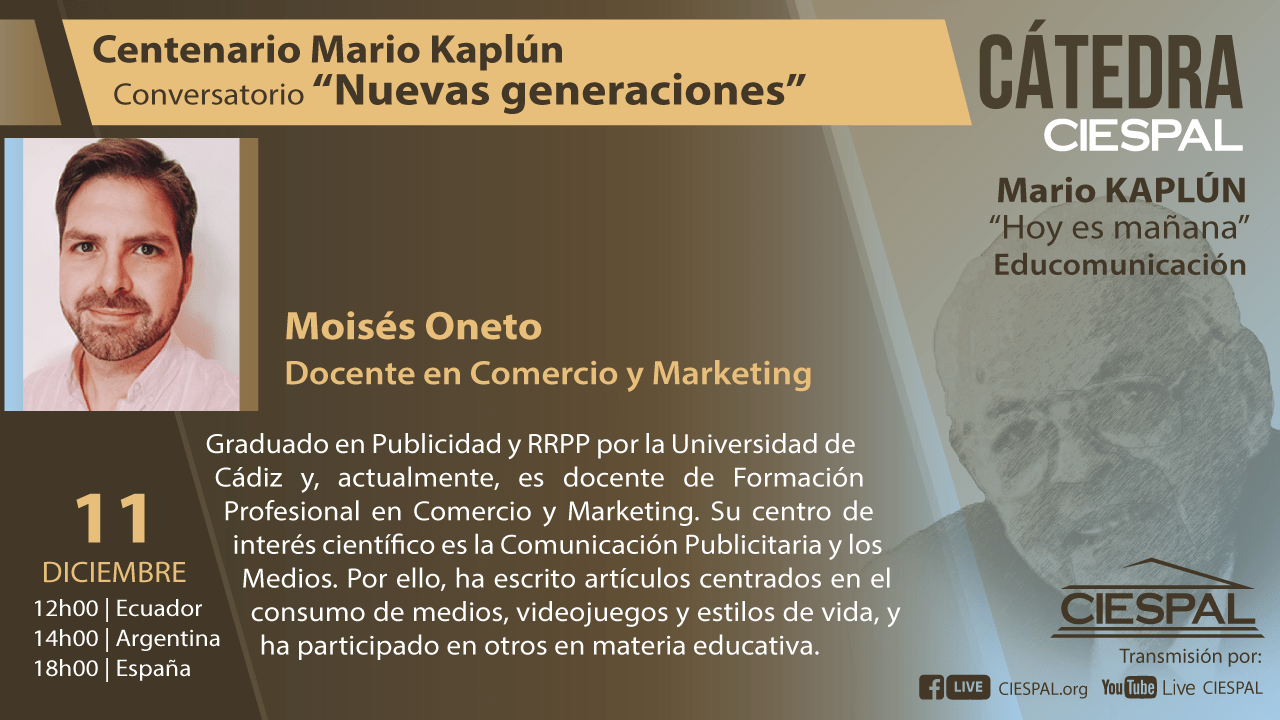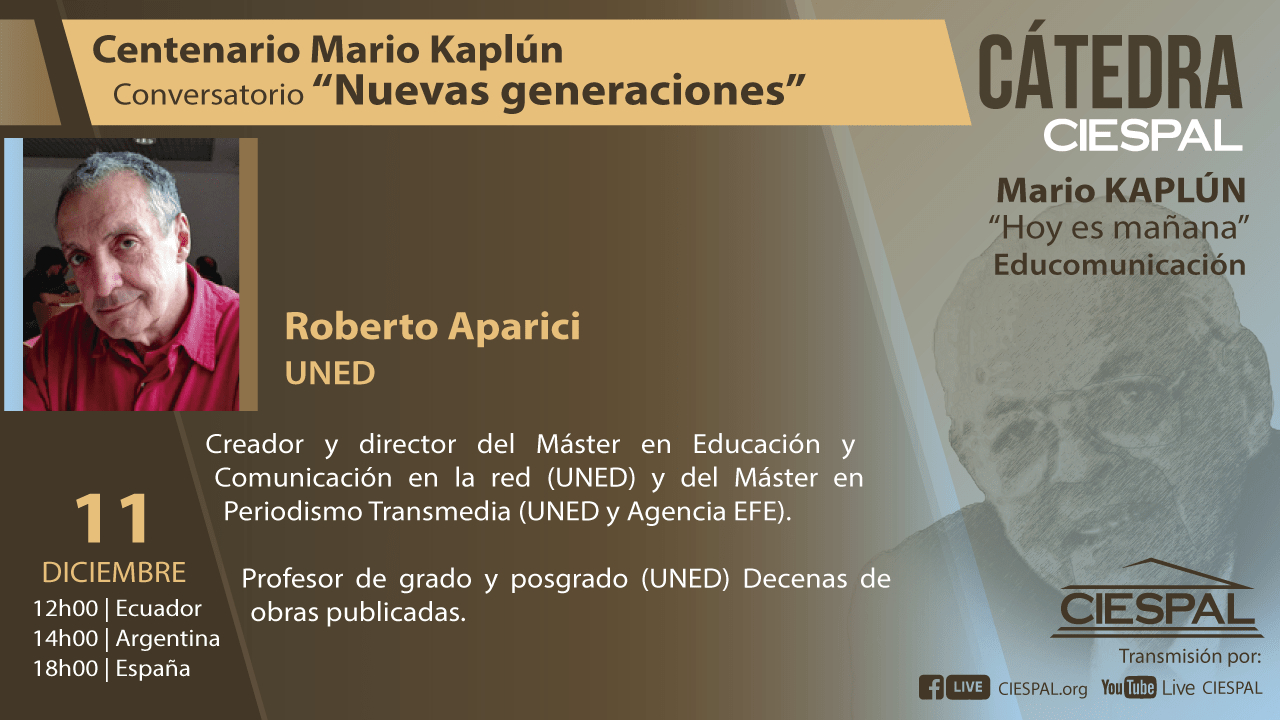 En el marco de la Cátedra CIESPAL de Educomunicación Mario Kaplún «Hoy es mañana» y en el marco del Centerio de Mario Kaplún, hemos organizado el conversatorio: «Nuevas generaciones» que lo realizaremos el 11 de diciembre, a las 12h00 de Ecuador, 14h00 de Argentina y 18h00 de España.