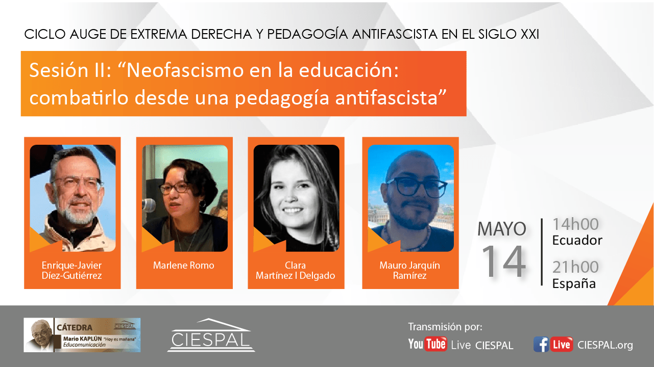 La sesión II del conversatorio CICLO AUGE DE EXTREMA DERECHA Y PEDAGOGÍA ANTIFASCISTA EN EL SIGLO XXI, se desarrollará el miércoles 14 de mayo a las 14h00 (hora Ecuador) y 21h00 (hora España). El título de este segundo conversatorio es “Neofascismo en la educación: combatirlo desde una pedagogía antifascista”. Contará con la participación de:
