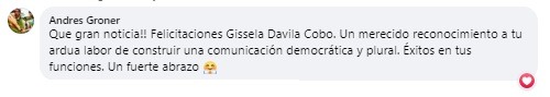 ¡Felicidades a @GisselaDavilaC, una incansable promotora de los derechos de comunicación! https://t.co/Y7GFOqJQNr