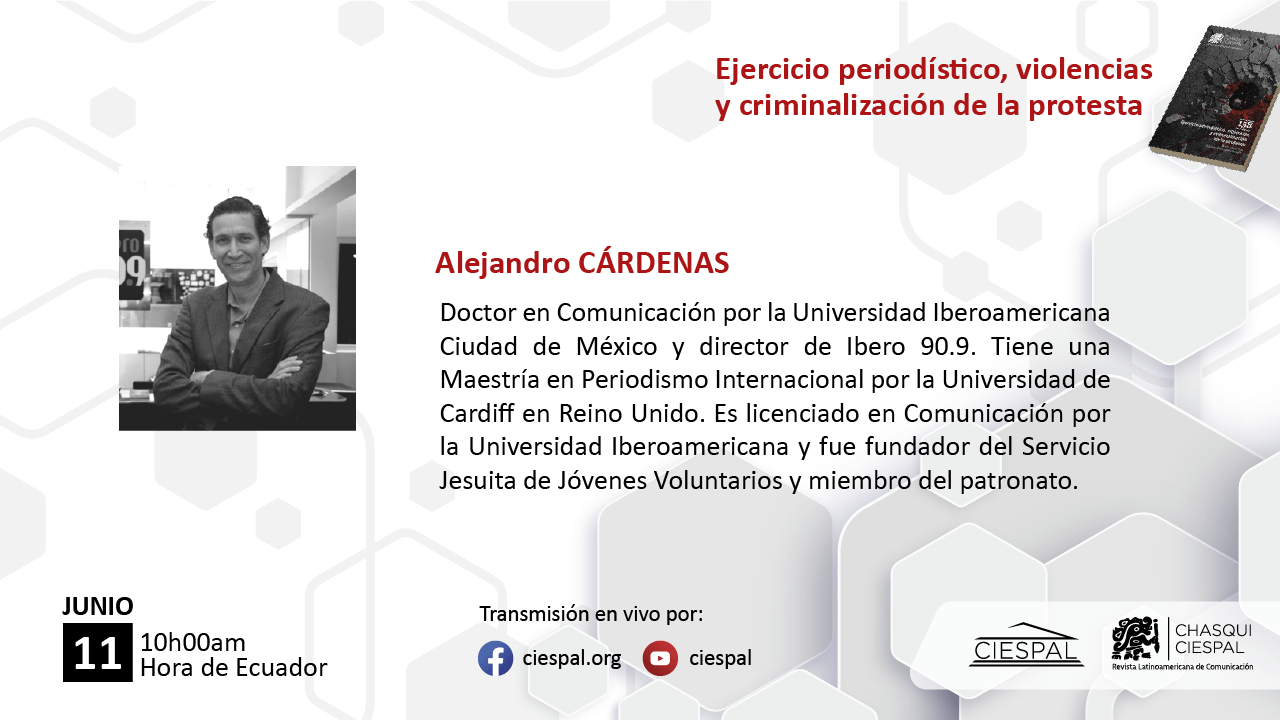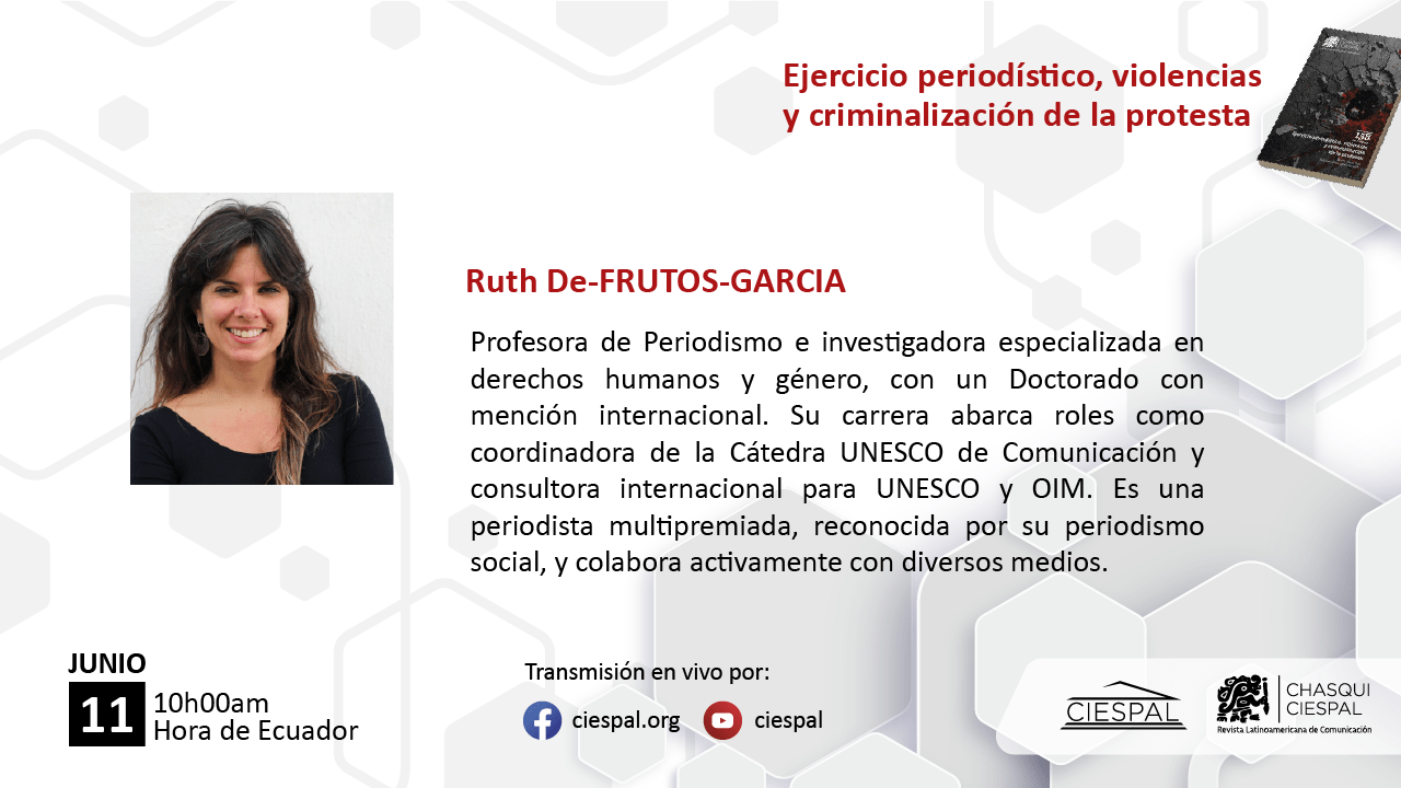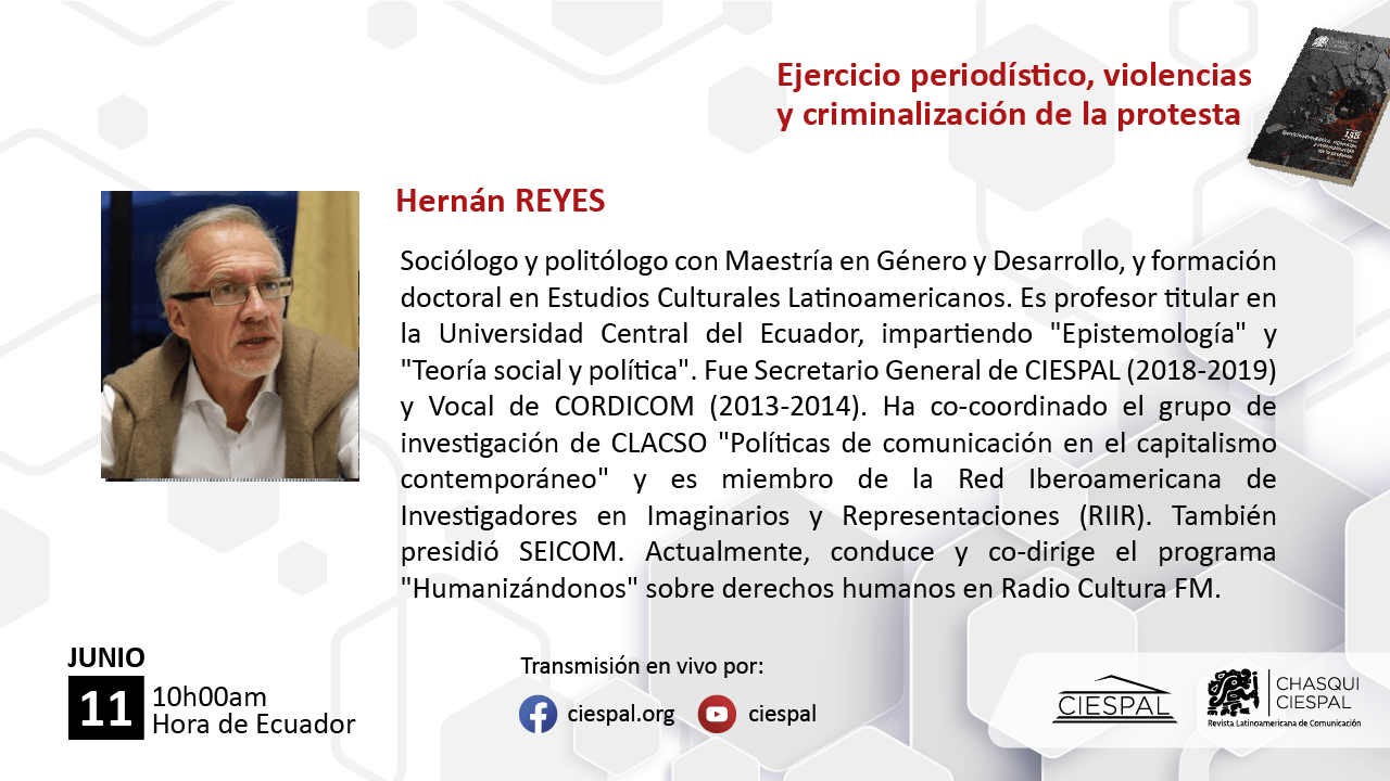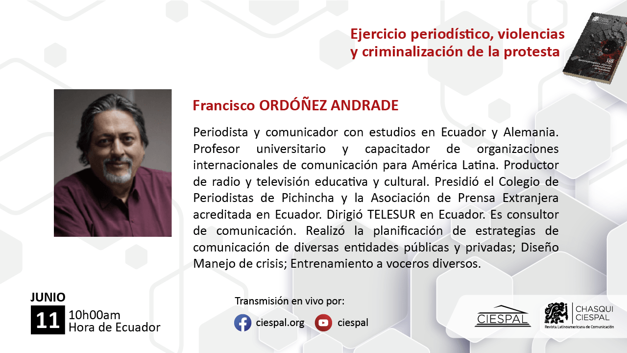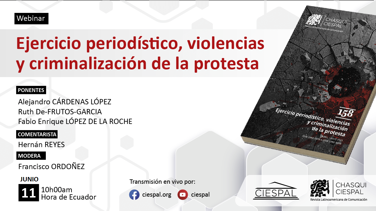 Con el objetivo de profundizar en los contenidos del monográfico «Ejercicio periodístico, violencias y criminalización de la protesta», correspondiente a la edición 158 de la Revista Latinoamericana de Comunicación Chasqui, el Centro Internacional de Estudios Superiores de Comunicación para América Latina (CIESPAL) invita a participar en este lanzamiento, que se realizará de forma virtual el 11 de junio a las 10h00 (hora de Ecuador).
