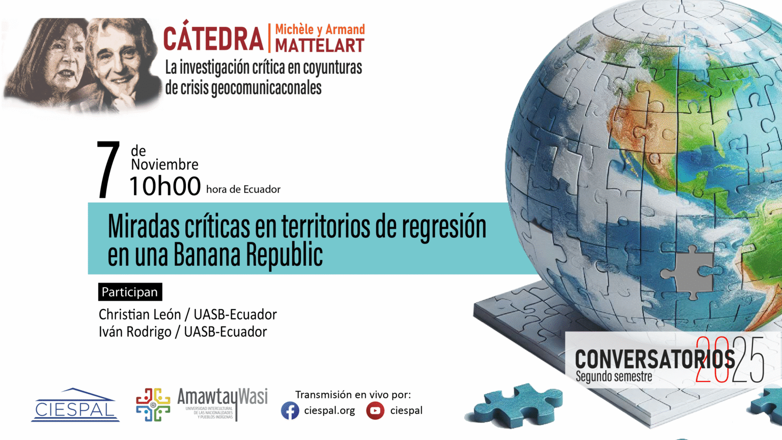 En el marco de la Cátedra Cátedra Michèle y Armand Matelart, el Centro Internacional de Estudios Superiores de Comunicación para América Latina, CIESPAL, con el apoyo de la carrera de Comunicación de la Universidad Amawtay Wasi, continúan con el segundo ciclo de conversatorios.