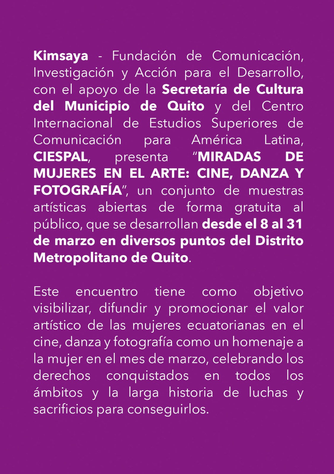 La fundación Kimsaya (Fundación de Comunicación, Investigación y Acción para el Desarrollo), con el apoyo de la Secretaría de Cultura del Distrito Metropolitano de Quito y del Centro Internacional de Estudios Superiores de Comunicación para América Latina, CIESPAL, presenta “MIRADAS DE MUJERES EN EL ARTE: CINE, DANZA Y FOTOGRAFÍA”, un conjunto de muestras artísticas que están abiertas de forma gratuita al público y se desarrollan desde el 8 al 31 de marzo en diversos puntos del Distrito Metropolitano.