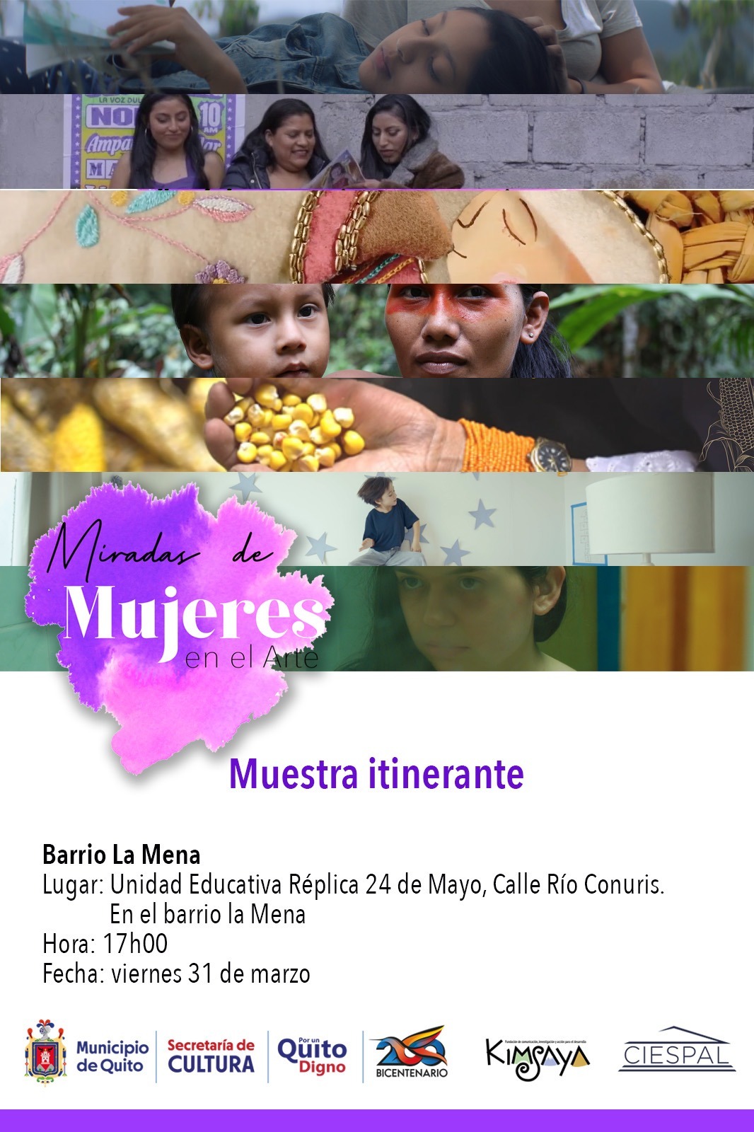 Las mujeres adquieren poco a poco un rol creativo y laboral en el sector audiovisual y cinematográfico del país, sin embargo, sus obras no se conocen o se conocen muy poco, por ello es fundamental desde todos los sectores apuntar a fortalecer la difusión y distribución de estos trabajos. Los sectores rurales o periféricos de la ciudad son los que menos acceso tienen a estas propuestas locales, por ello, para KIMSAYA Fundación de Comunicación, Investigación y Acción para el Desarrollo, a través del evento Miradas de Mujeres en el Arte, es de vital importancia llegar a los barrios y a las parroquias rurales del Distrito Metropolitano, en este sentido, contaremos con dos proyecciones de obras audiovisuales, y conversatorios junto a sus directoras, que se presentarán en: