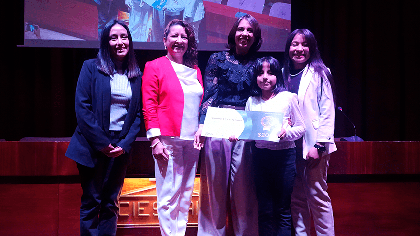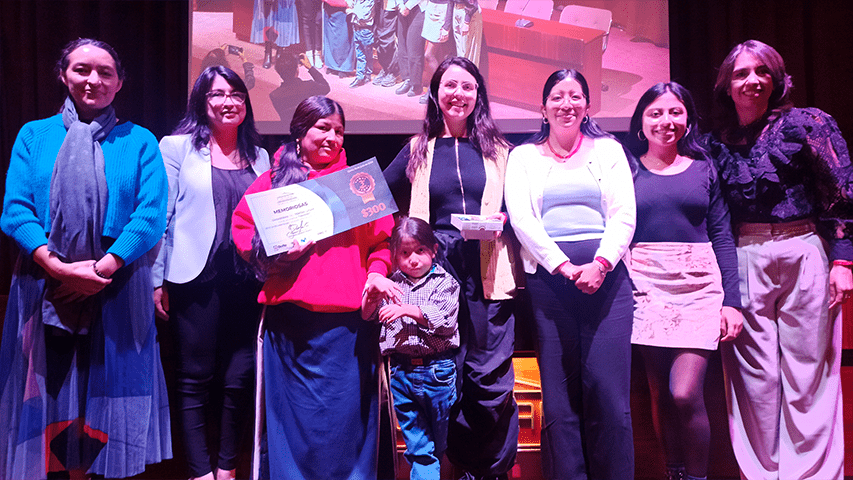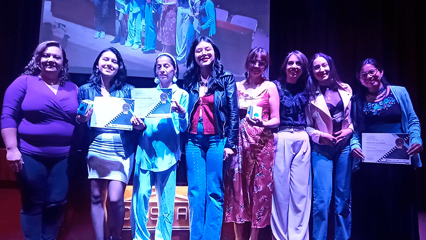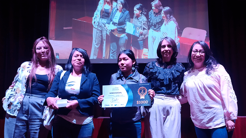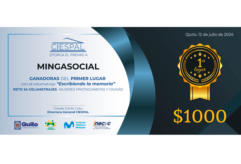 Cinthya Guaña, productora de cine e investigadora social, en representación del jurado calificador, entregó el reconocimiento al equipo Mingasocial, acreedoras del Primer lugar, con el celumetraje “Escribiendo la memoria”. En esta producción narran la migración interna, maternidad, y acceso a la educación superior como una preocupación constante de nuestras madres y abuelas.