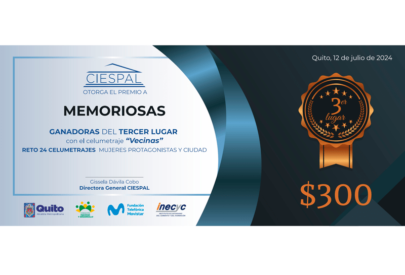 El viernes, 12 de julio de 2024, se realizó la premiación de “#Reto24 | Mujeres protagonistas y ciudad” enfocado en la realización de celumetrajes -videos producidos únicamente con teléfonos móviles-. Participaron 19 equipos de mujeres que contaron historias que nos llevaron a la reflexión. En este evento se premió el 1ro, 2do y 3er lugar, el premio del público y 3 menciones de honor.
