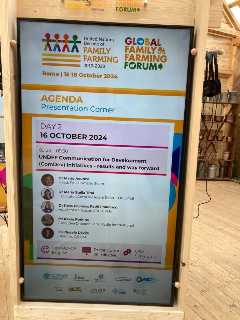 Estos resultados fueron presentados en la conferencia Decenio de las Naciones Unidas de la Agricultura Familiar Iniciativas de Comunicación para el Desarrollo: resultados y camino a seguir” en el que participaron: Mario Acunzo, Jefe de ComDev de FAO; María Stella Tirol, Facilitador de ComDev Asia y Decana de CDC-UPLB; Rosa Pilipinas Fadri Francisco, docente de CDC-UPLB; Kevin Perkins, Director Ejecutivo de la Radio Agrícola Internacional y Gissela Dávila, coordinadora de Onda Rural y Directora General de CIESPAL.
