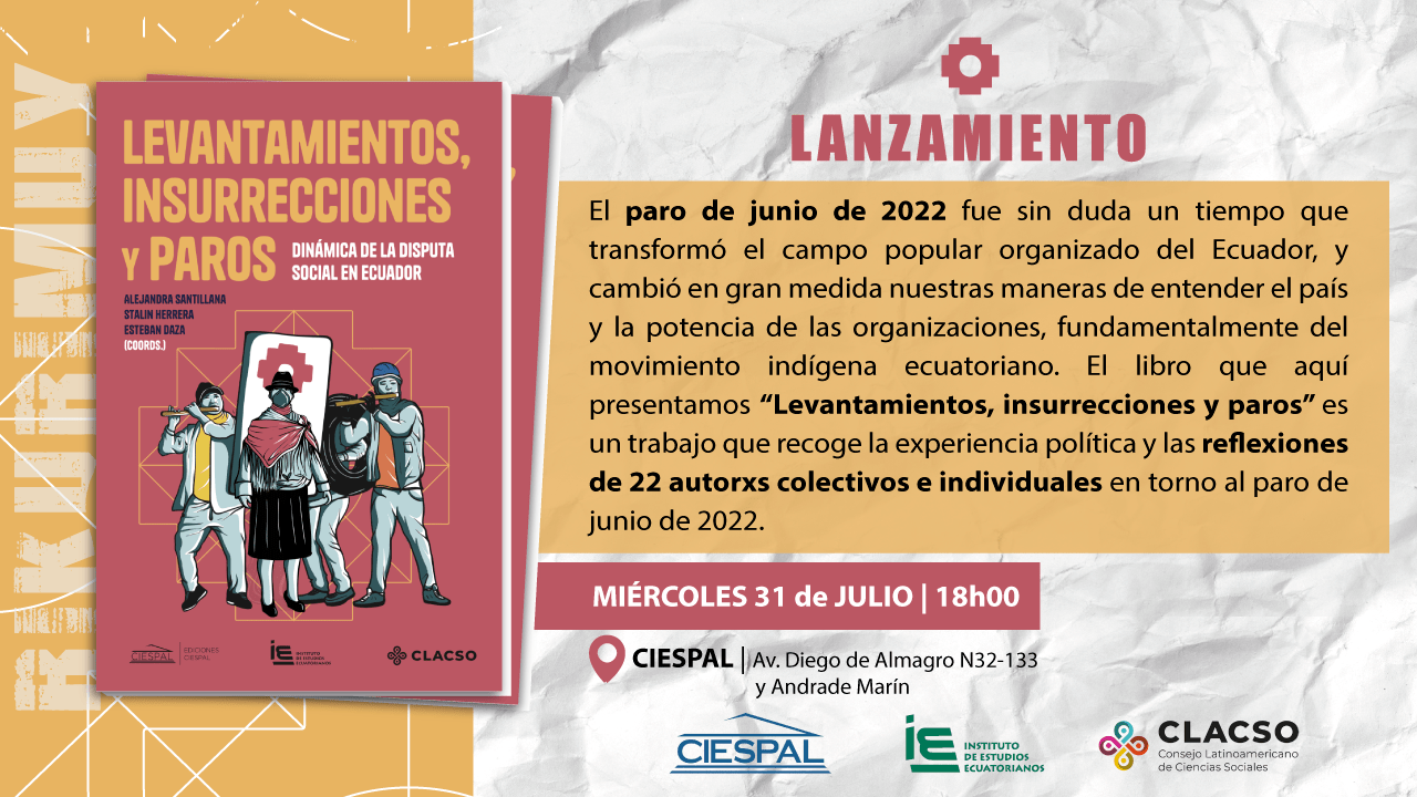 El próximo 31 de julio, a las 18h00, el Instituto de Estudios Ecuatorianos, con el respaldo académico de CLACSO y CIESPAL presentarán el libro “Levantamientos, insurrecciones y paros. Dinámica de la disputa social en Ecuador”. El paro de junio de…