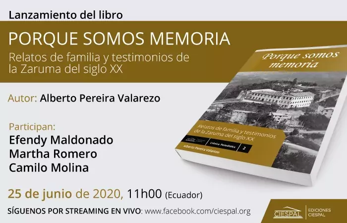TRANSMISIÓN EN VIVO Youtube Facebook Ediciones CIESPAL tiene el agrado de presentar el libro Porque somos memoria. Relatos de familia y testimonios de la Zaruma del siglo XX, el cual explora, a través del ejercicio de la memoria, la reconstrucción…