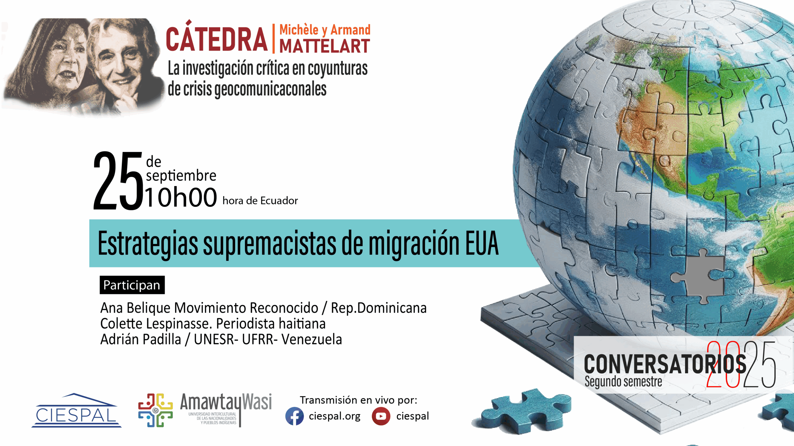 El 25 de septiembre de 2025, la Cátedra Michèle y Armand Mattelart de CIESPAL organizó el conversatorio “Estrategias supremacistas de migración EUA”, con la participación de Ana Belique, Colette Lespinasse y Adrián Padilla. Edizon León, coordinador nacional de la Cátedra…