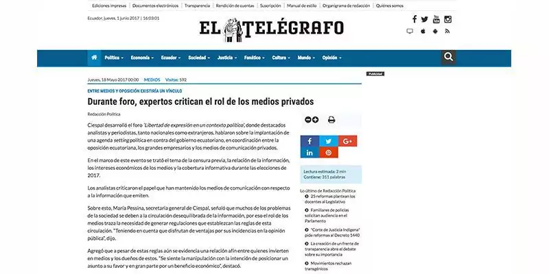 Síntesis: A las 17:00 de este martes 16 de mayo se realizó el “foro libertad de expresión en un contexto político”, en Ciespal ubicada al norte de Quito. Una de las expositoras fue Cynthia García periodista argentina del periódico Página 12….