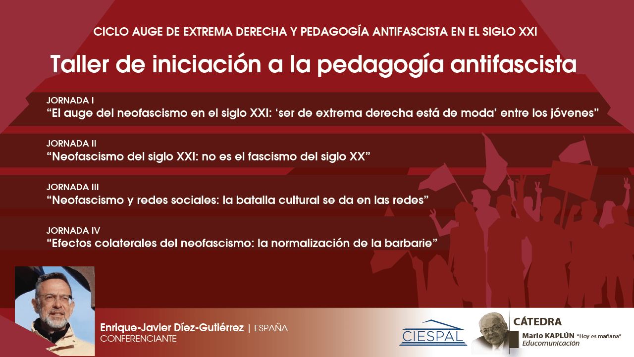 En ese contexto, La Cátedra Mario Kaplún, de CIESPAL, ha organizado el Taller de iniciación a la pedagogía antifascista, a desarrollarse en 4 jornadas, que se compartirán a través de las redes sociales de CIESPAL.