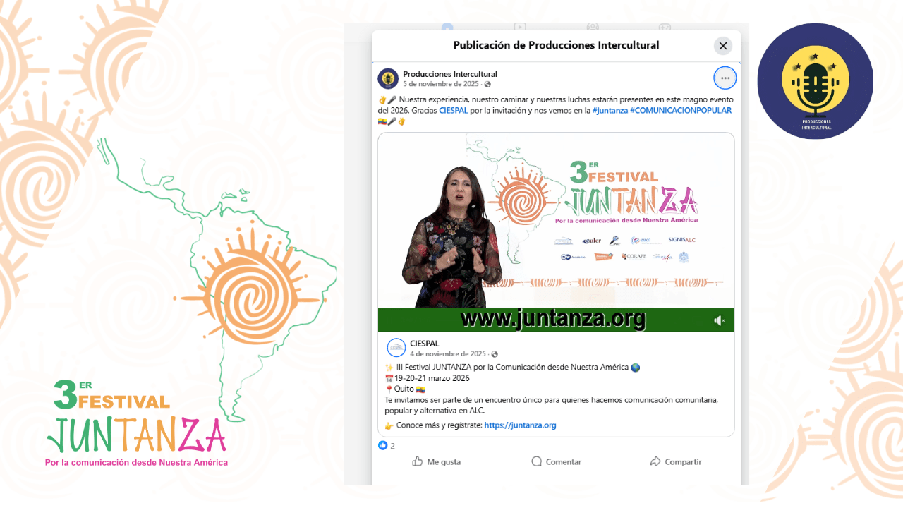 Publicación de Producciones Intercultural – Festival JUNTANZA La nota ha sido publicada en:Medio/Redes Sociales: Facebook – Producciones InterculturalFecha: 2025-11-05Link: https://www.facebook.com/share/p/12L6eyBCRqu/