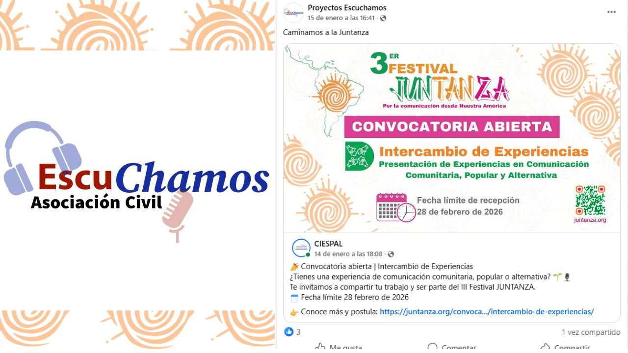 Publicación de Proyectos Escuchamos – Festival JUNTANZA La nota ha sido publicada en:Medio/Redes Sociales: Facebook – Proyectos EscuchamosFecha: 2026-01-14Link: https://www.facebook.com/share/p/1AWBuUvwMv/