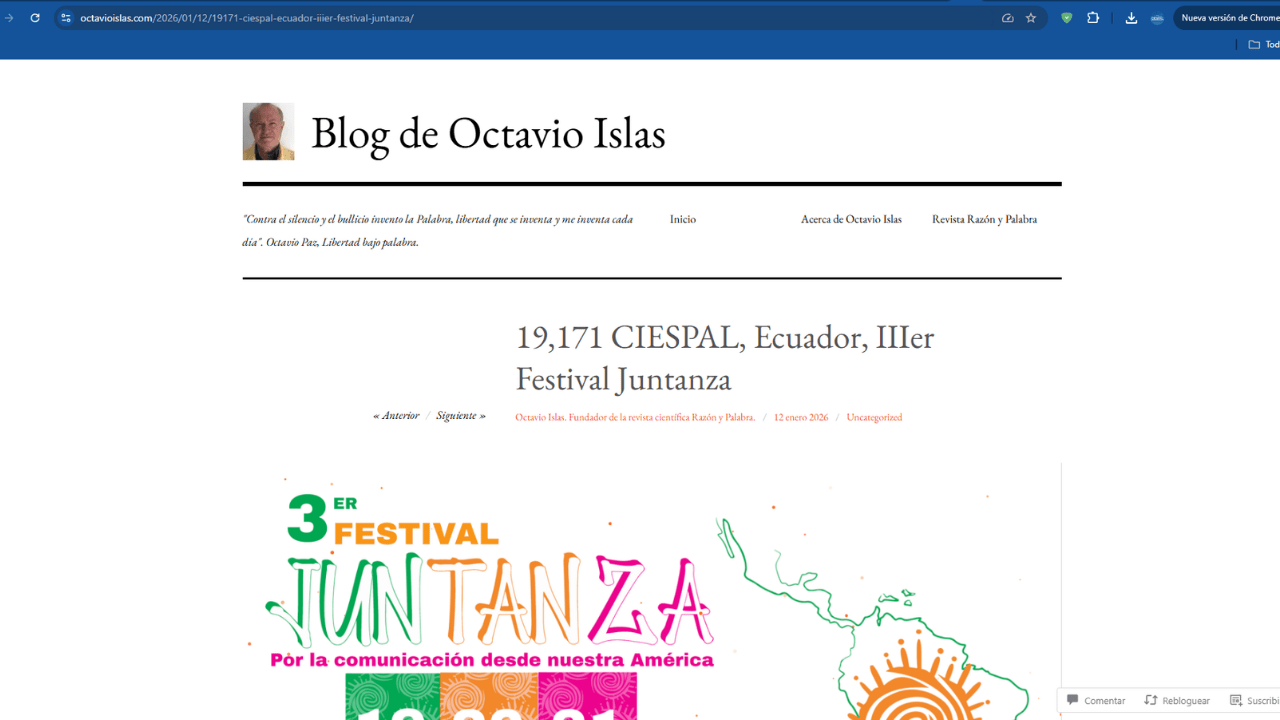 Publicación en Blog Octavio Islas – Festival JUNTANZA La nota ha sido publicada en:Medio: Blog de Octavio IslasFecha: 2026-01-12Link: https://octavioislas.com/2026/01/12/19171-ciespal-ecuador-iiier-festival-juntanza/