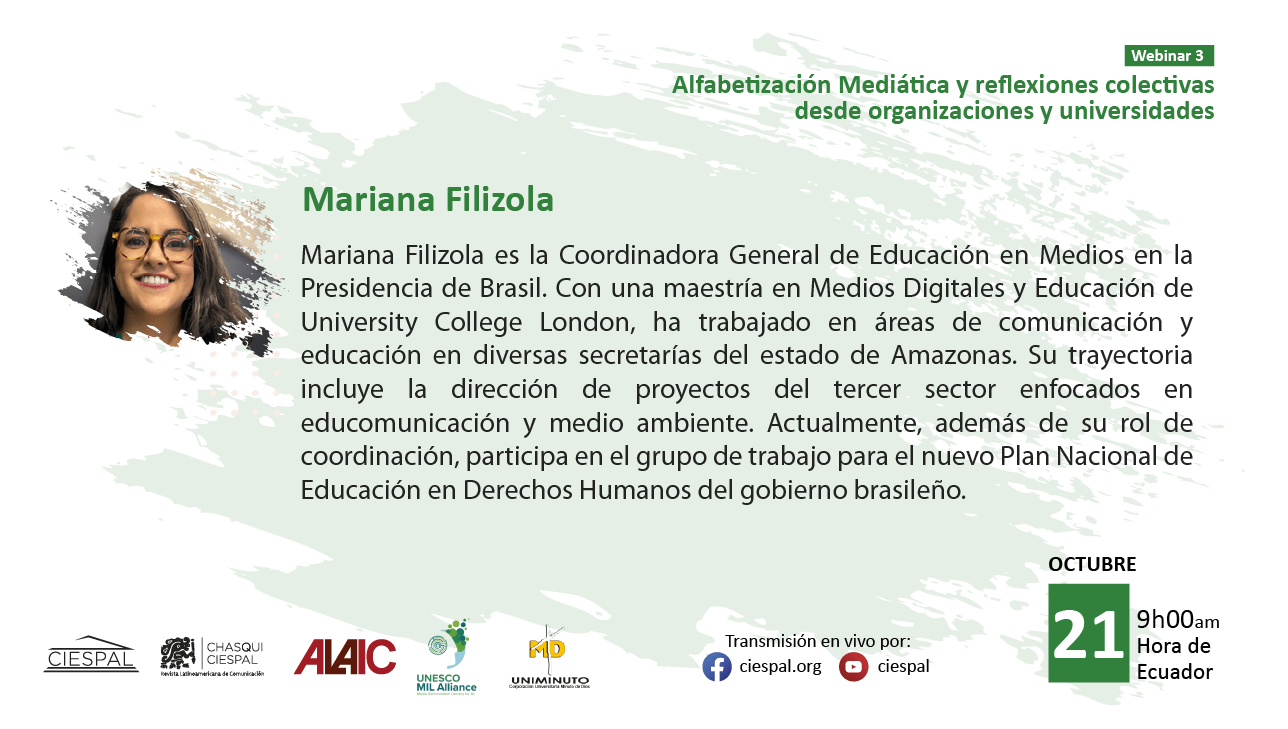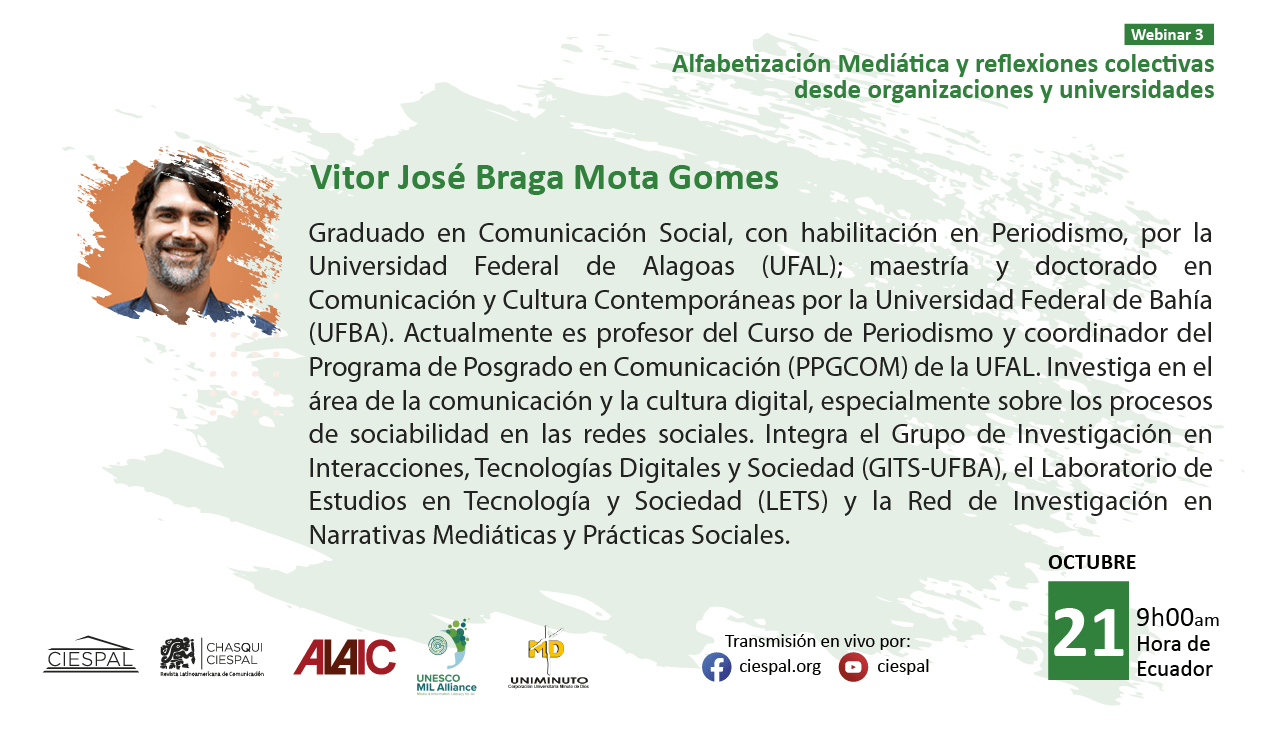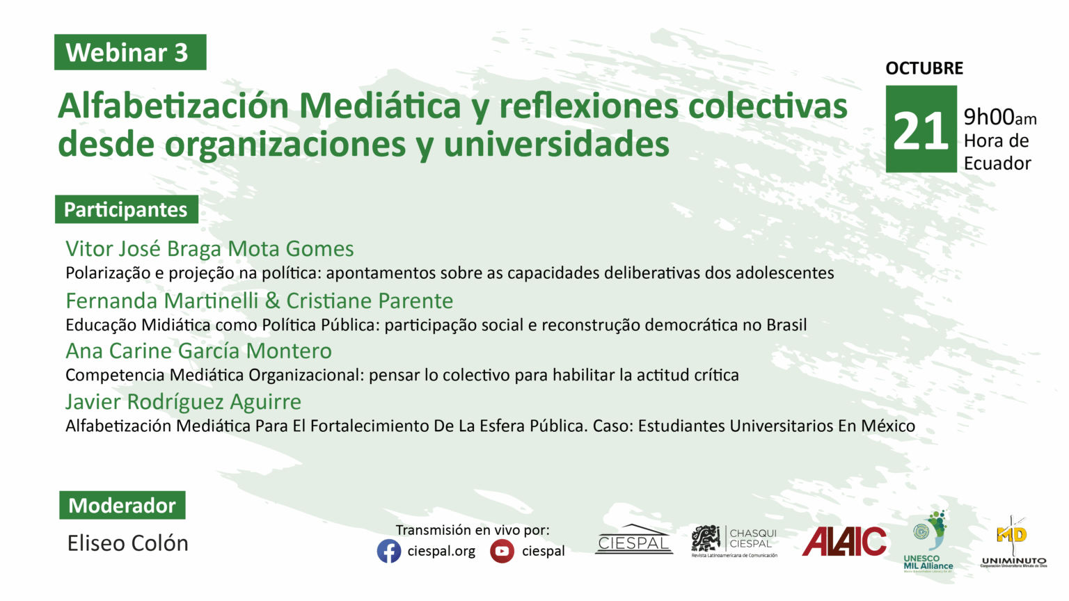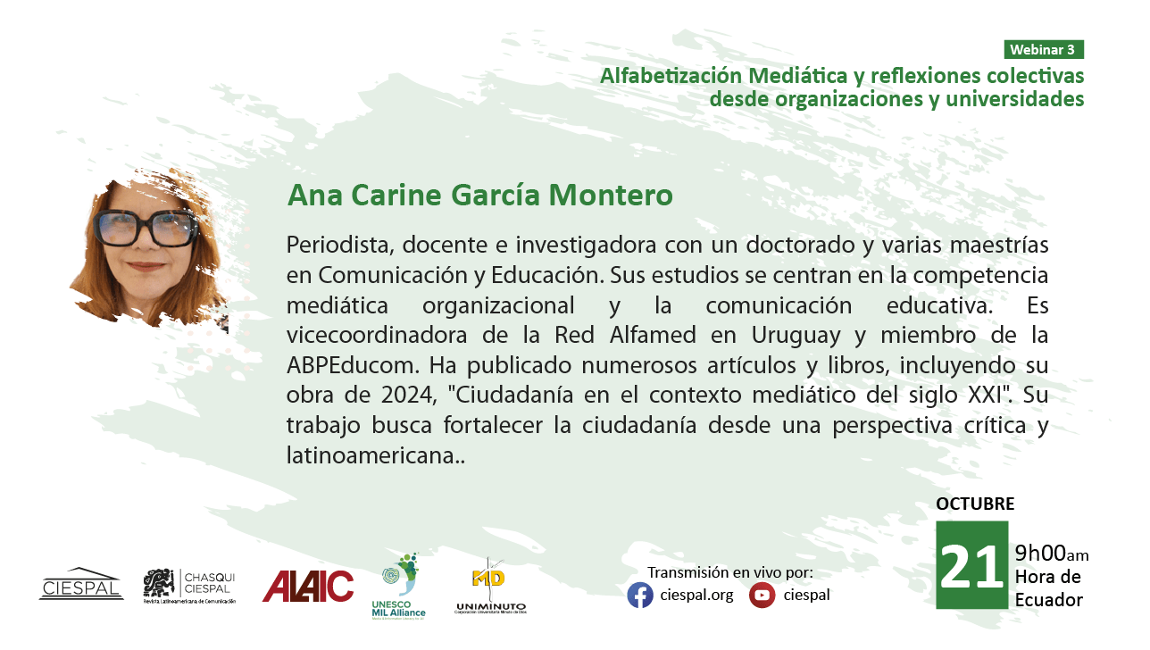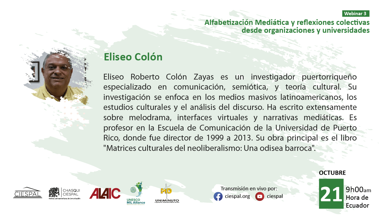 El tercer encuentro, titulado “Alfabetización mediática y reflexiones colectivas desde organizaciones y universidades”, se realizará el martes 21 de octubre de 2025 a las 09h00 (hora Ecuador), con la moderación de Eliseo Colón.