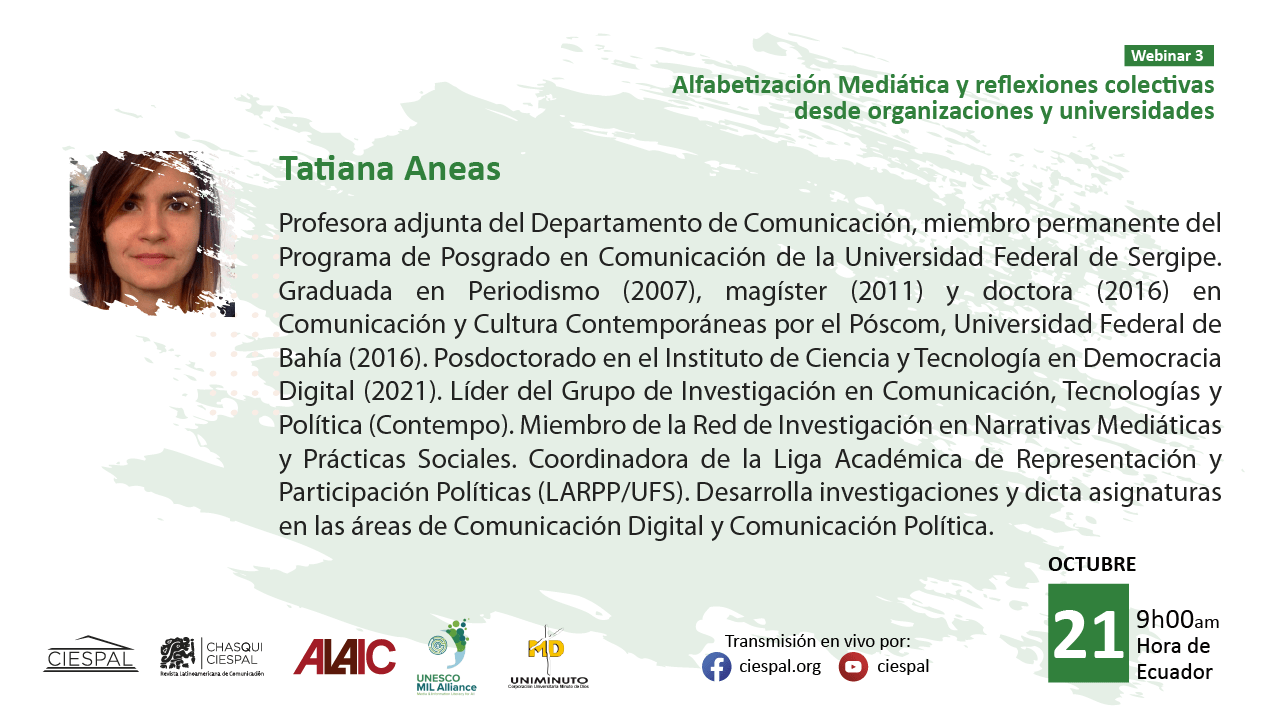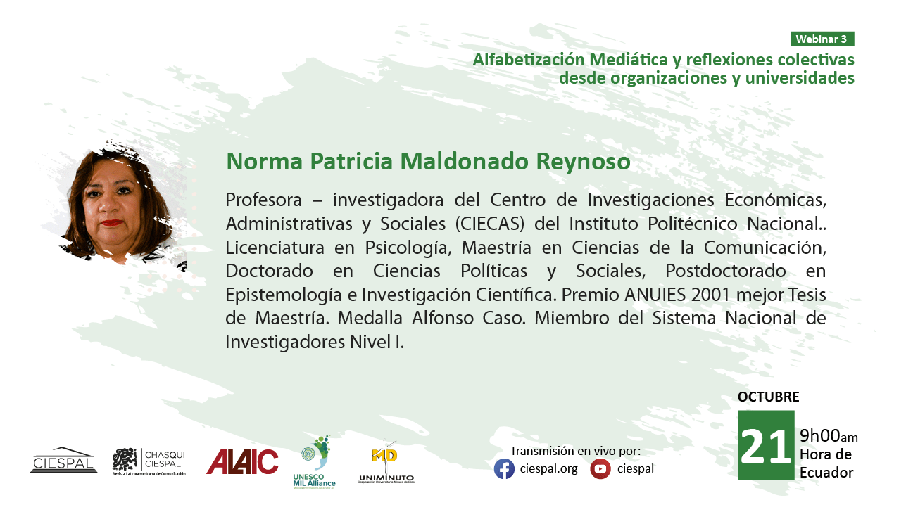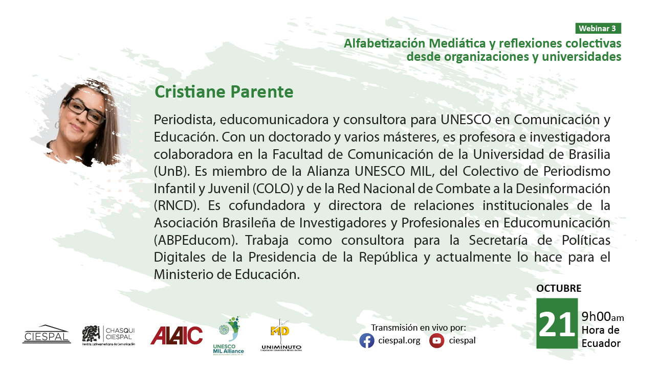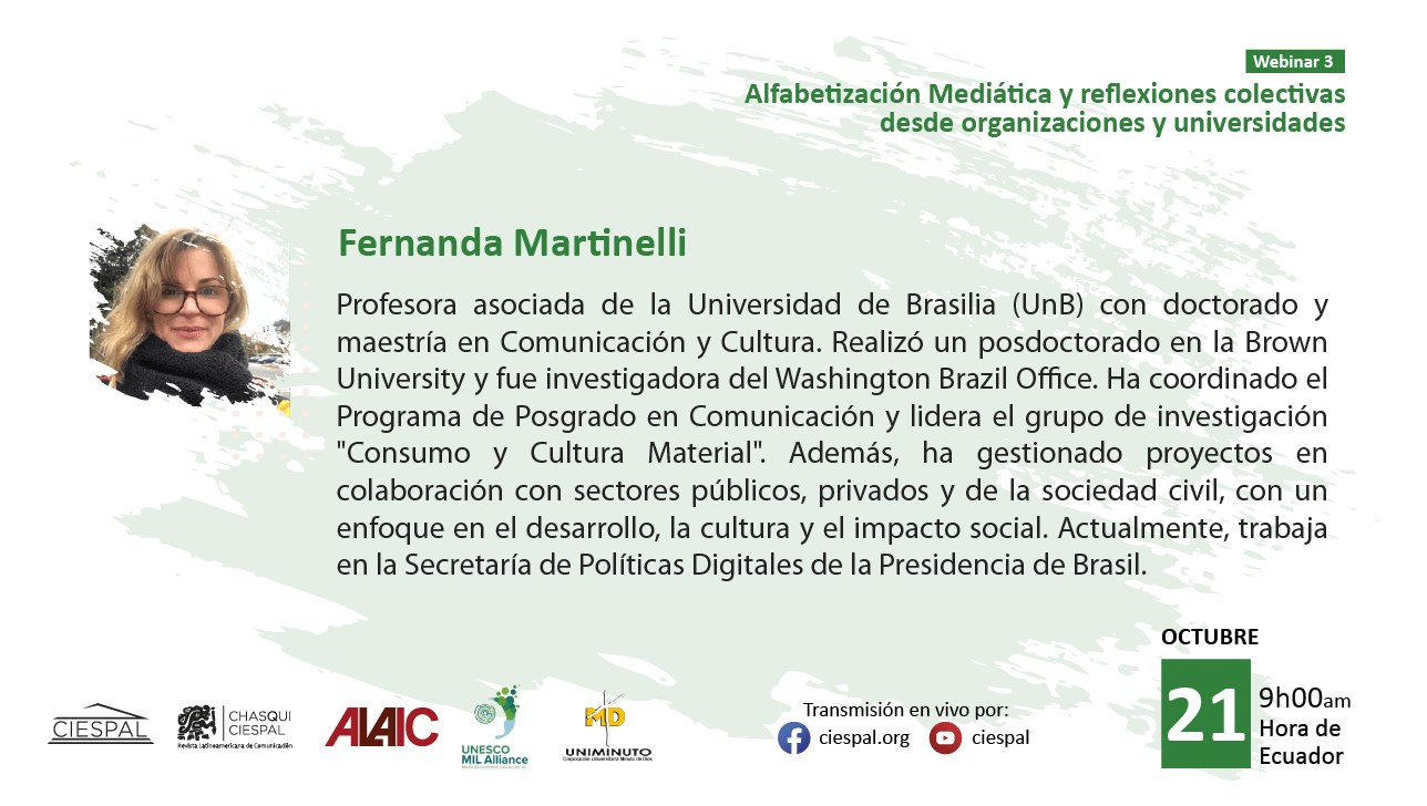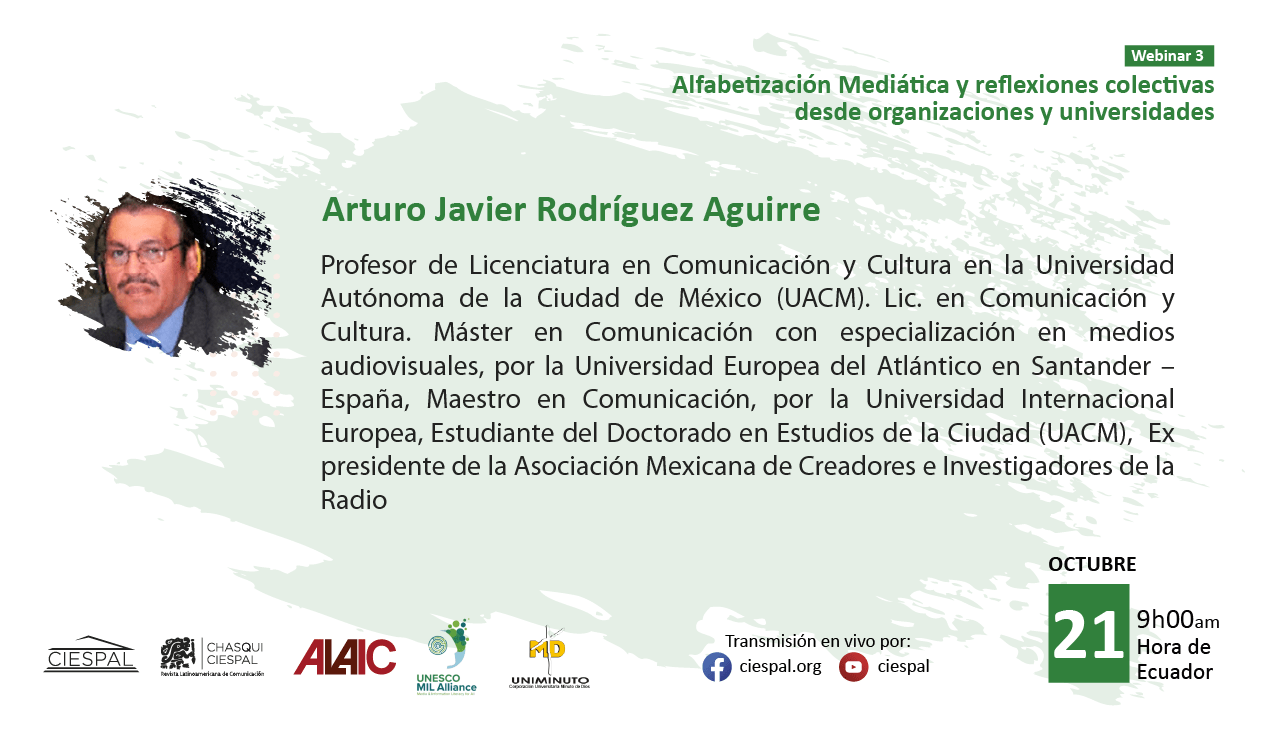 El tercer encuentro, titulado “Alfabetización mediática y reflexiones colectivas desde organizaciones y universidades”, se realizará el martes 21 de octubre de 2025 a las 09h00 (hora Ecuador), con la moderación de Eliseo Colón.