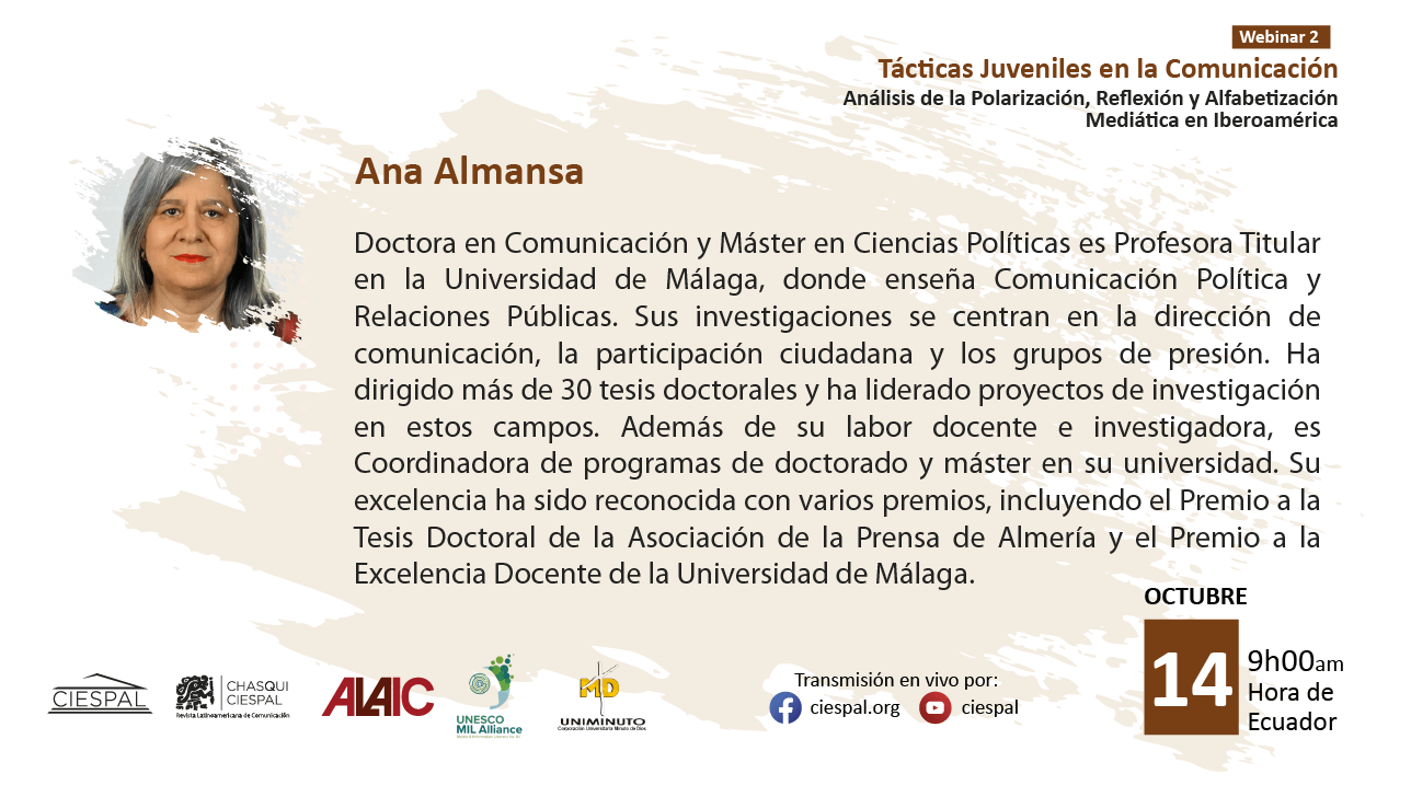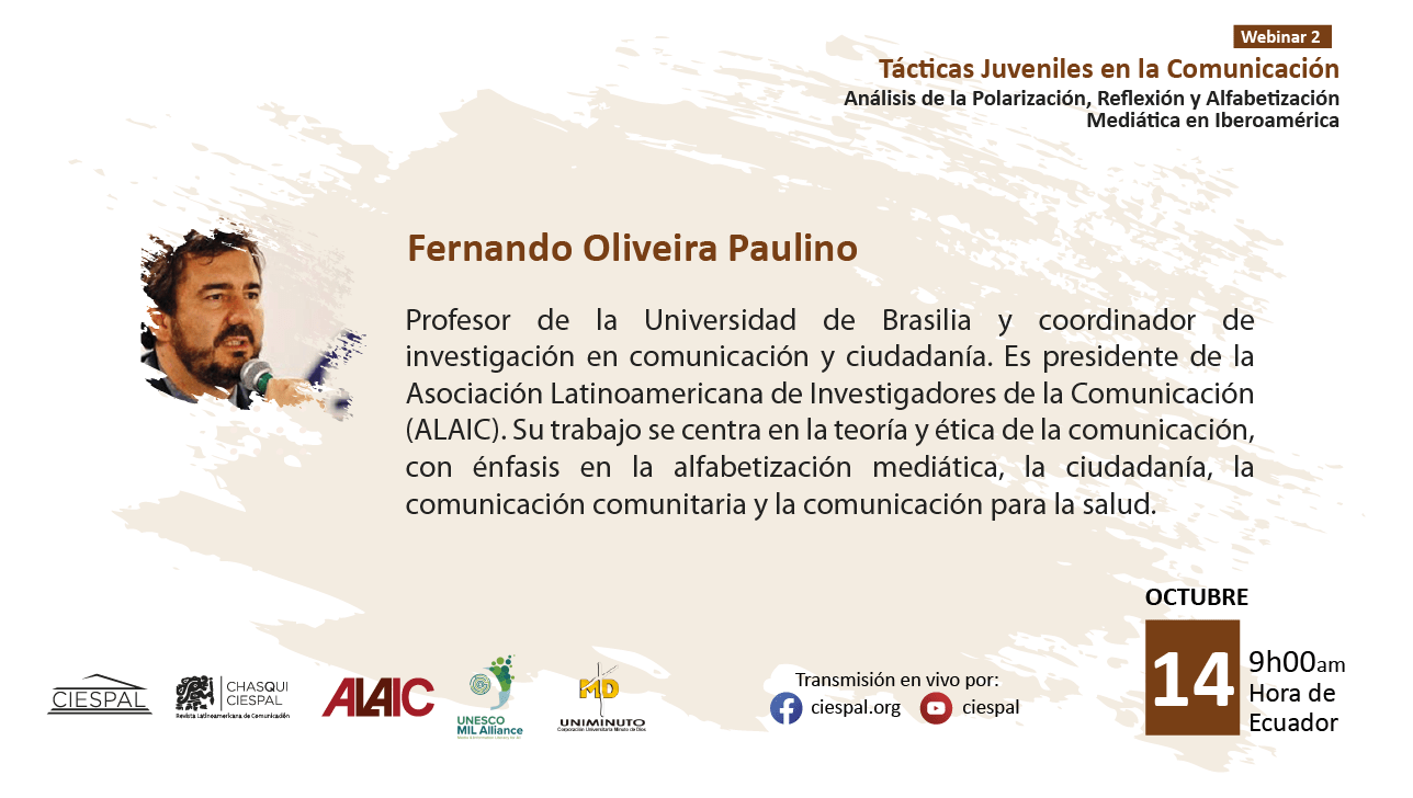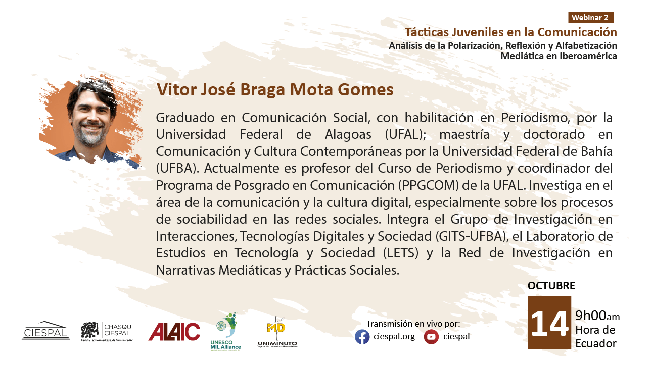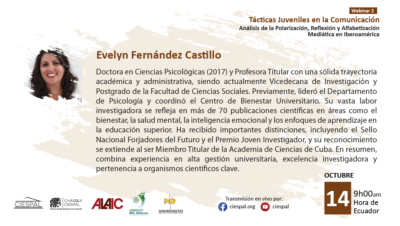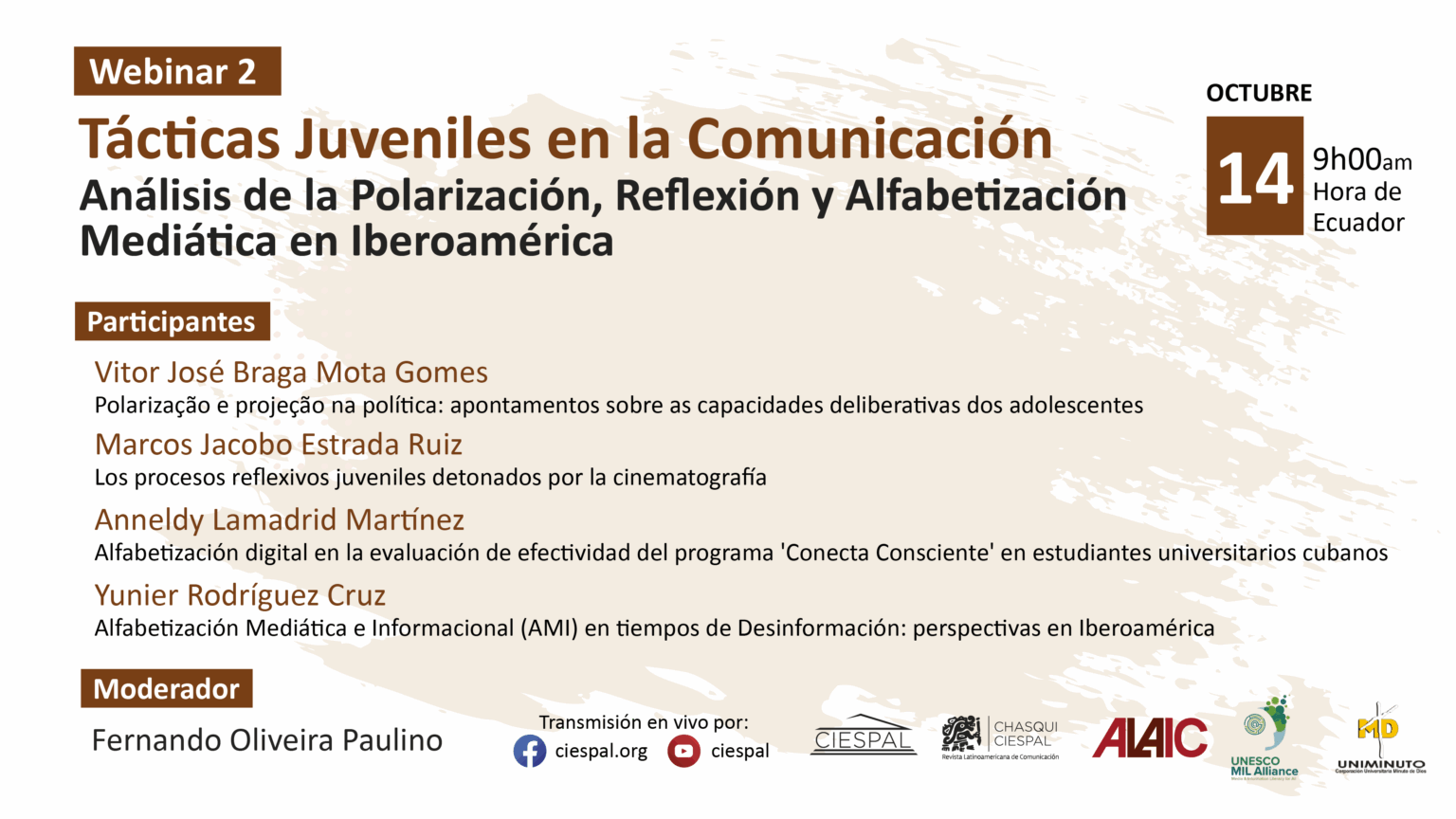 El segundo encuentro, titulado “Tácticas Juveniles en la Comunicación: Análisis de la Polarización, Reflexión y Alfabetización Mediática en Iberoamérica”, se realizará el martes 14 de octubre de 2025 a las 09h00 (hora Ecuador), con la moderación de Fernando Oliveira Paulino.