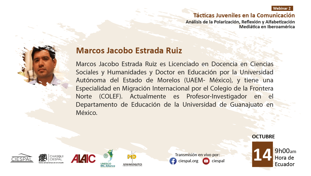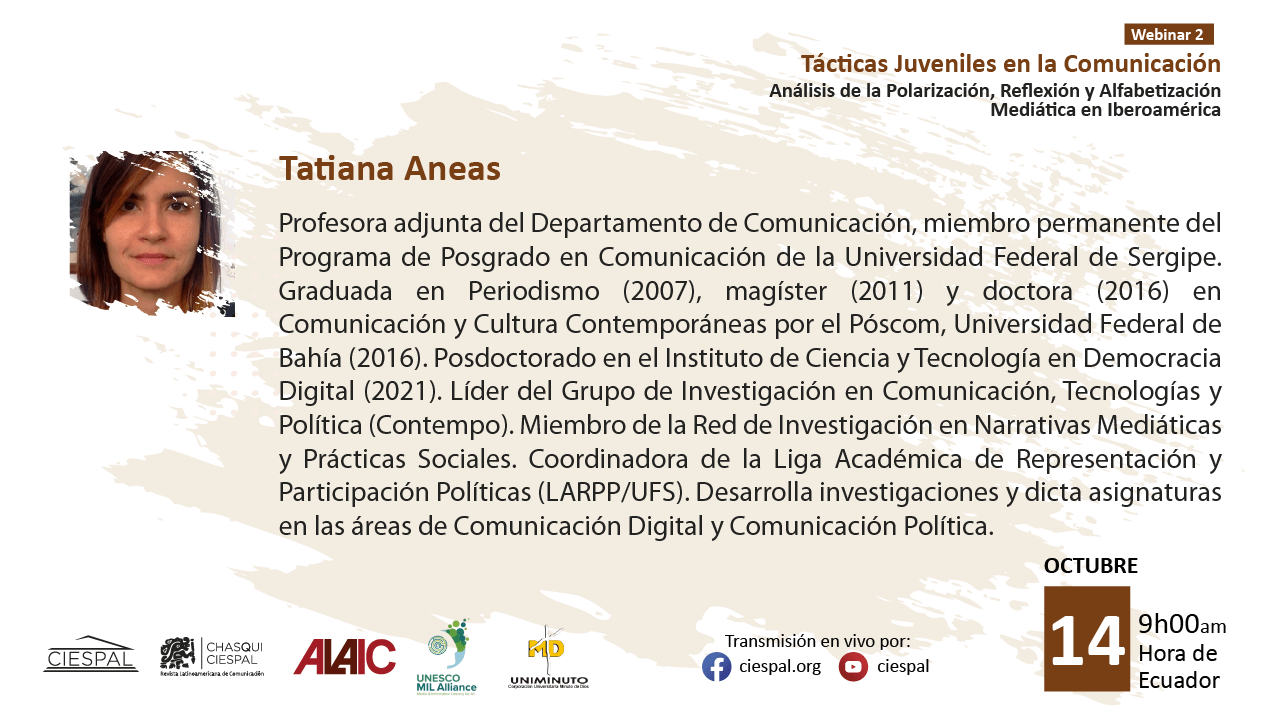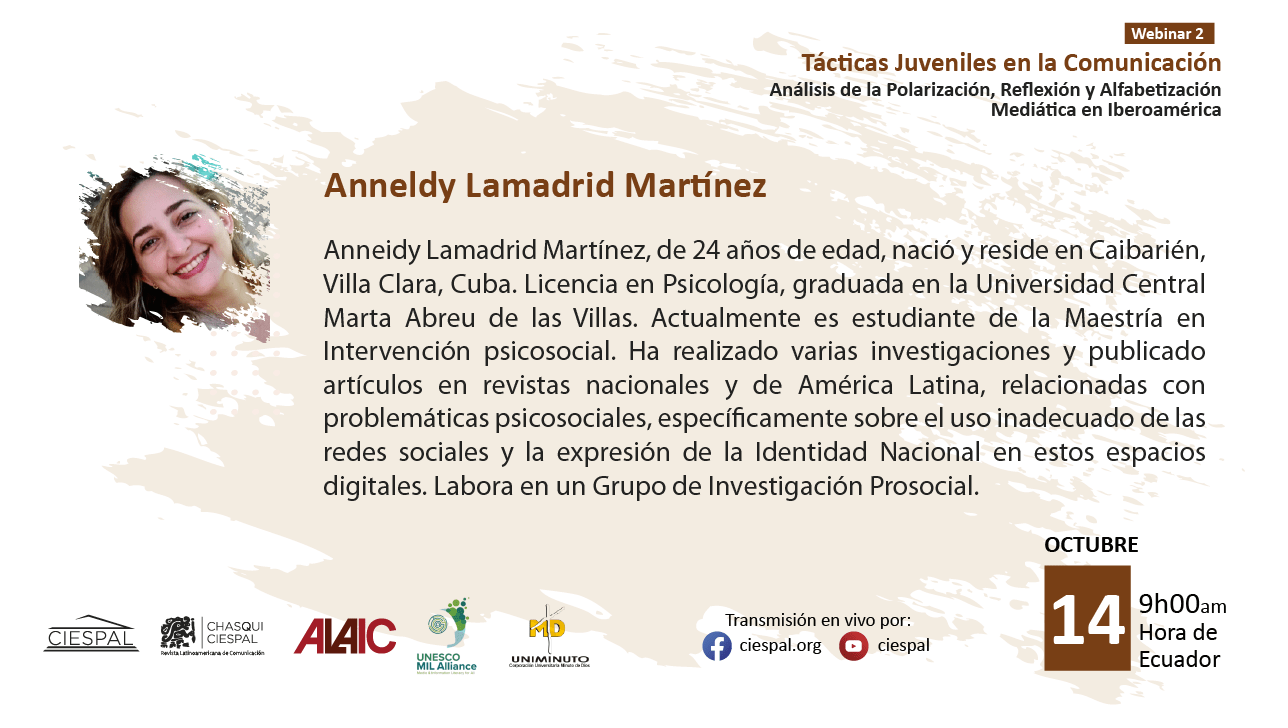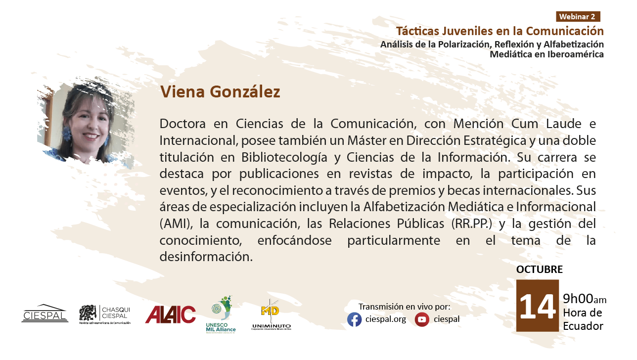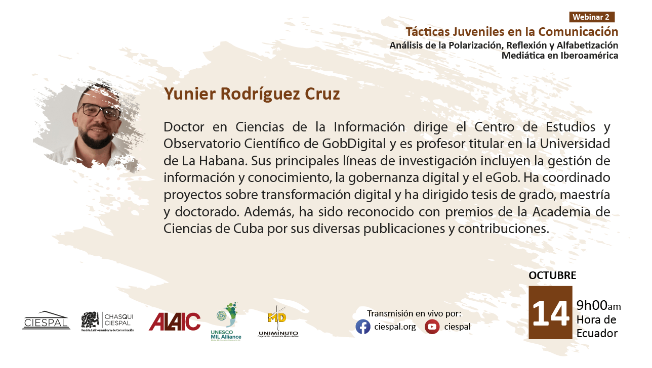El segundo encuentro, titulado “Tácticas Juveniles en la Comunicación: Análisis de la Polarización, Reflexión y Alfabetización Mediática en Iberoamérica”, se realizará el martes 14 de octubre de 2025 a las 09h00 (hora Ecuador), con la moderación de Fernando Oliveira Paulino.