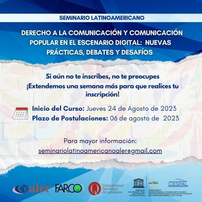 La Asociación Latinoamericana de Educación y Comunicación Popular (ALER), el Foro Argentino de Radios Comunitarias (FARCO), la Universidad Nacional de Quilmes y el Centro Internacional de Estudios Superiores de Comunicación para América Latina (CIESPAL) a través de su Cátedra UNESCO-CIESPAL: Libertad de expresión y Sociedades del Conocimiento hemos organizamos Seminario Latinoamericano enfocado en el derecho a la comunicación y la comunicación popular en el escenario digital.