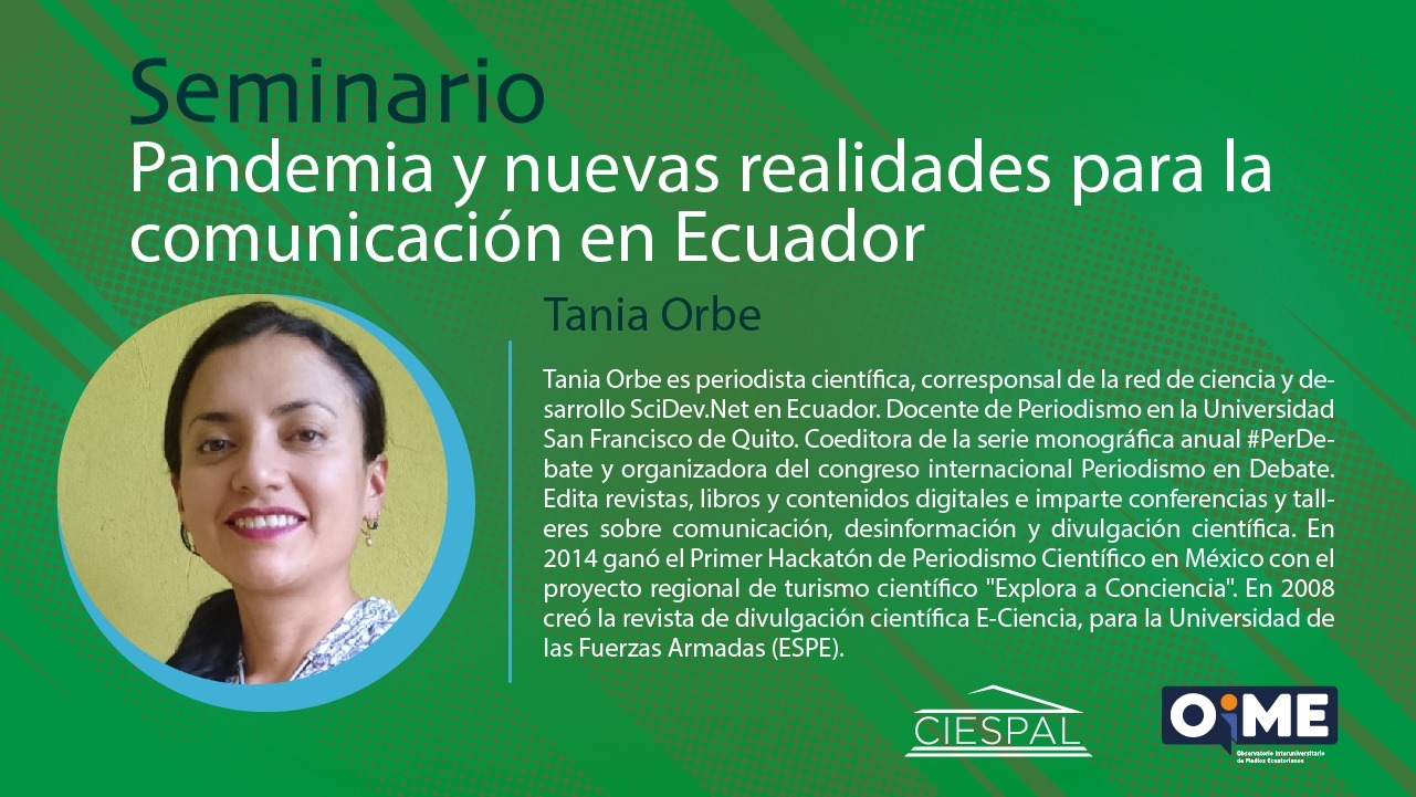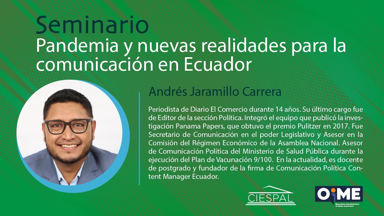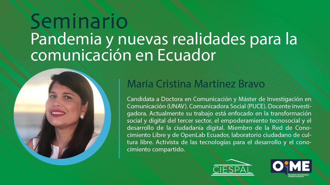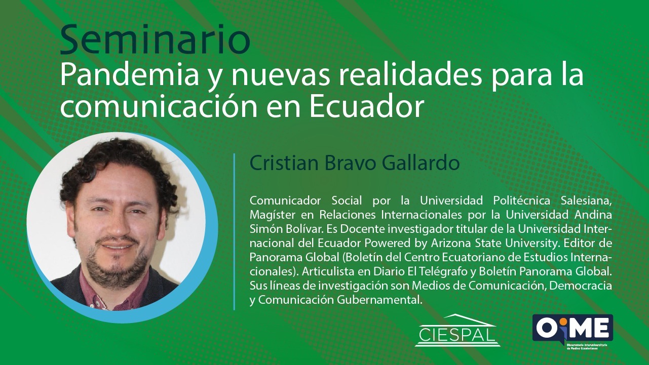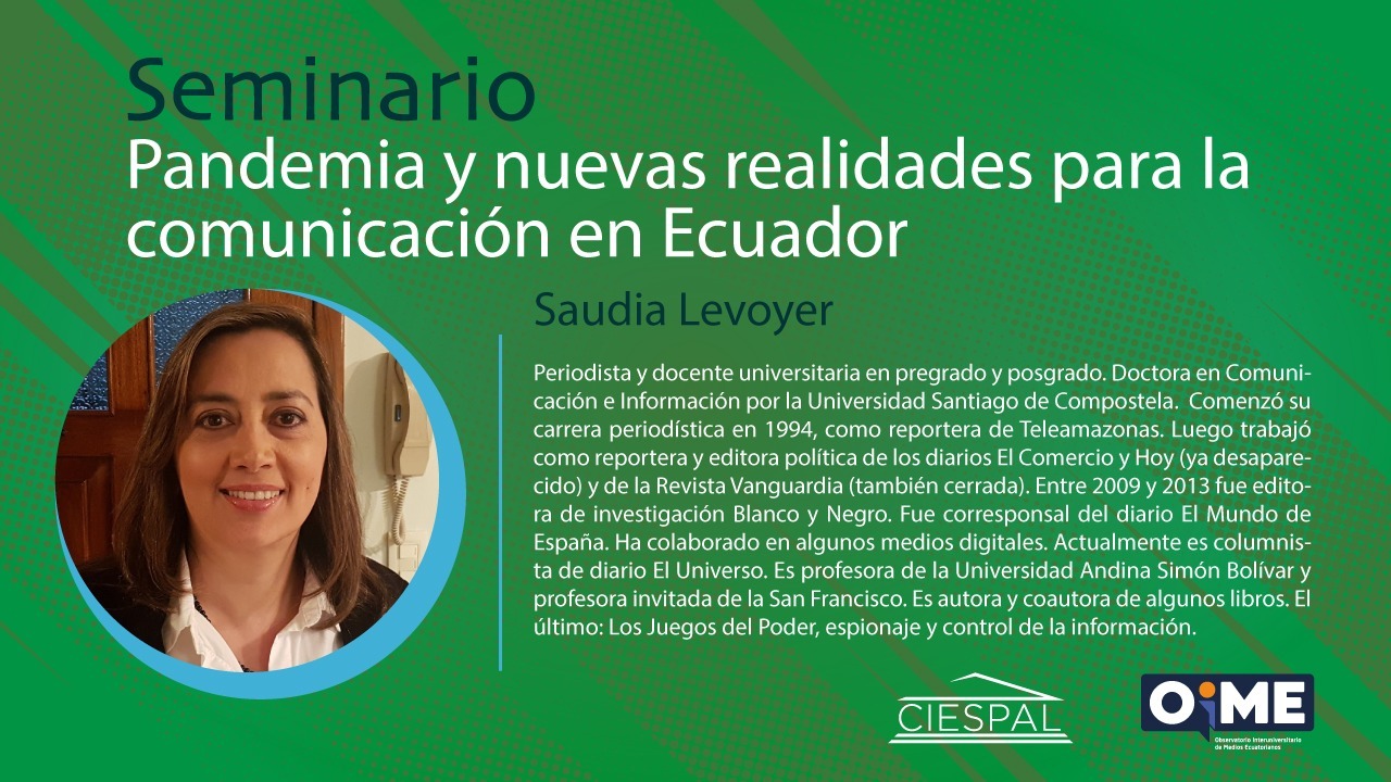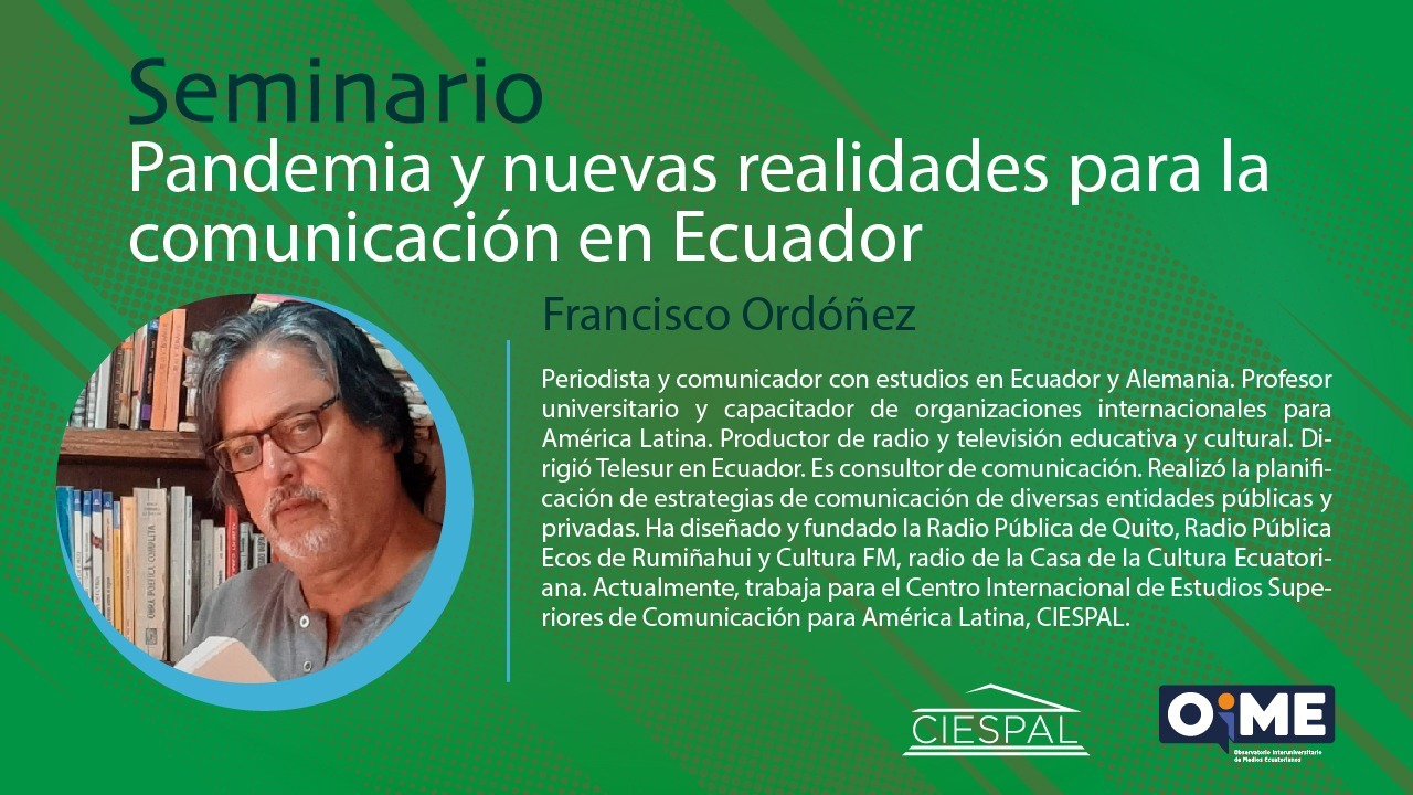 El Centro Internacional de Estudios Superiores de Comunicación para América Latina (CIESPAL) y el Observatorio Interuniversitario de Medios Ecuatorianos (OIME) tenemos el agrado de presentar la publicación «Pandemia y nuevas realidades para la comunicación en Ecuador» que forma parte de la Colección Periodística y nuevas culturas informativas de Ediciones CIESPAL. Esta obra cuenta con la coordinación editorial de Paulina Escobar Ronquillo.