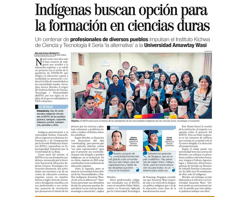 Co-fundadora del Kichwa Instituto of Science, Technology and Humaties. El KISTH es la red de profesionales kichwas y no kichwas que busca dar soluciones a las problemáticas comunitarias, nacionales e internacionales desde la académica, las humanidades, la ciencia y los saberes ancestrales.
