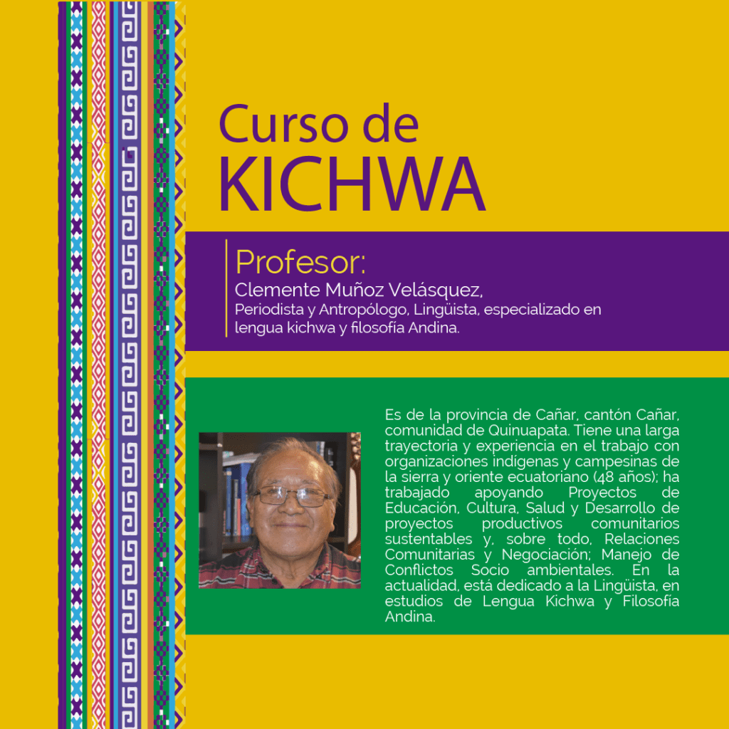 Este Curso virtual sincrónico del kichwa, Nivel 4, busca promover y optimizar la herramienta del idioma Kichwa para mantener la cultura, mediante la capacitación a los Líderes nativos- campesinos, jóvenes estudiantes de los colegios y universidades, particularmente a los Educadores bilingües, Técnicos agrícolas, Guías turísticos comunitarios, Promotores de salud, Yachak y otros profesionales, urbanos y rurales, que cumplen con la misión de ser promotores, educadores, guías turísticos e investigadores del idioma kichwa de las nacionalidades indígenas y las culturas ancestrales.